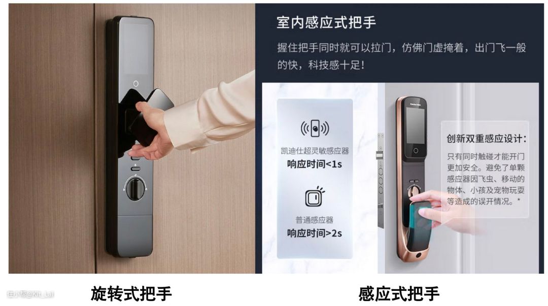 在使用上,两种形式的开锁方式便捷性和防误开锁都是感应式把手更优,而旋转式把手因为不用电源驱动,在紧急情况下也不用担心因为没电而开不了锁。