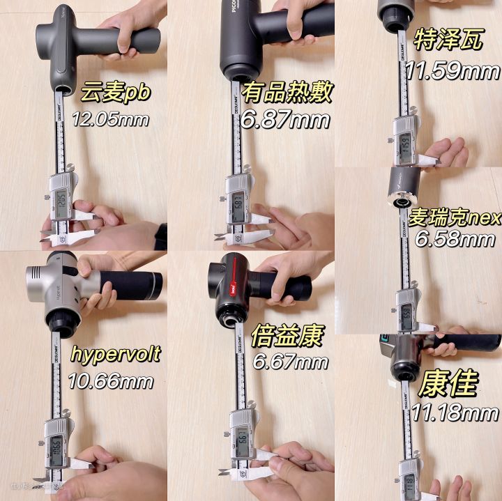 以上是7款筋膜枪的握感对比,体验下来握持宽度在48mm-50mm区间较为舒适,既能让女生轻松握持,也可以符合男生的手持需求。像 Hyperice Hypervolt属于太大宽度,手大的男生才能握住,而麦瑞克宽度太小,握起来没那么有实感。