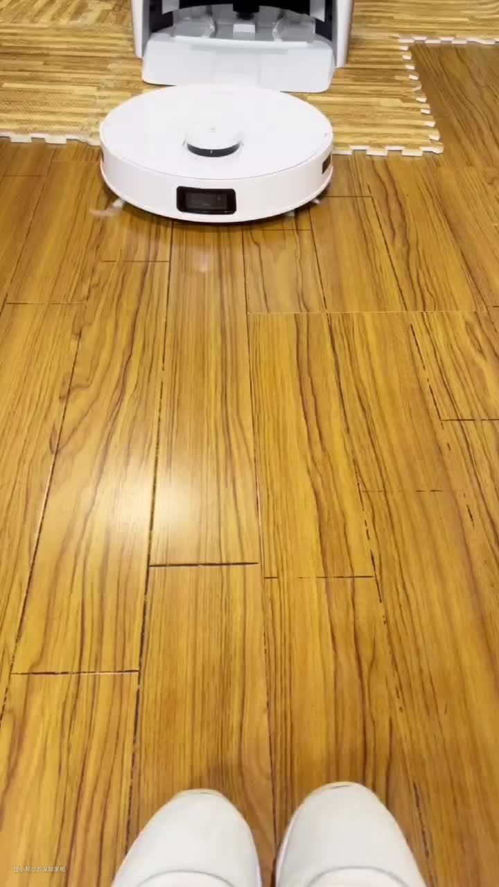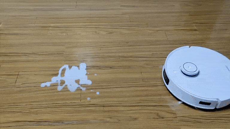 可以看到,地面上的牛奶不算少,地宝第一次经过时有一部分没擦到,但接触拖布的那部分地面已经干净了。地宝转回来又擦了一次,牛奶的痕迹已经完全消失。