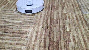 地宝第一次经过时吸口没有对准地上的豌豆,本来猜想会有一两粒豌豆被边刷弹飞。但事实证明并没有,第一次经过时接触到边刷边缘的豌豆尽数被清扫干净,第二次经过时吸口对准了豌豆一网打尽,这个清洁能力还是不错的。