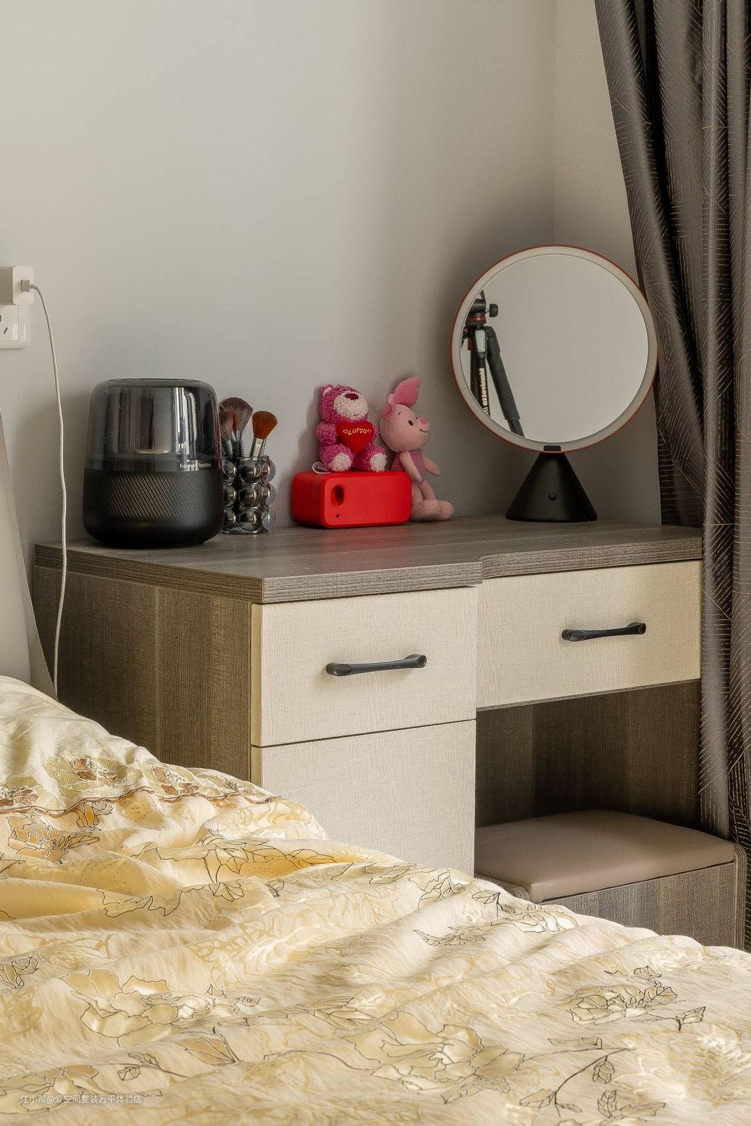 靠床边没有放床头柜,直接放了梳妆台,方便女主人在卧室里梳妆打扮,梳妆台同时也靠近窗边,采光条件也非常好,充足的光线更有利于画出精致漂亮的妆容。