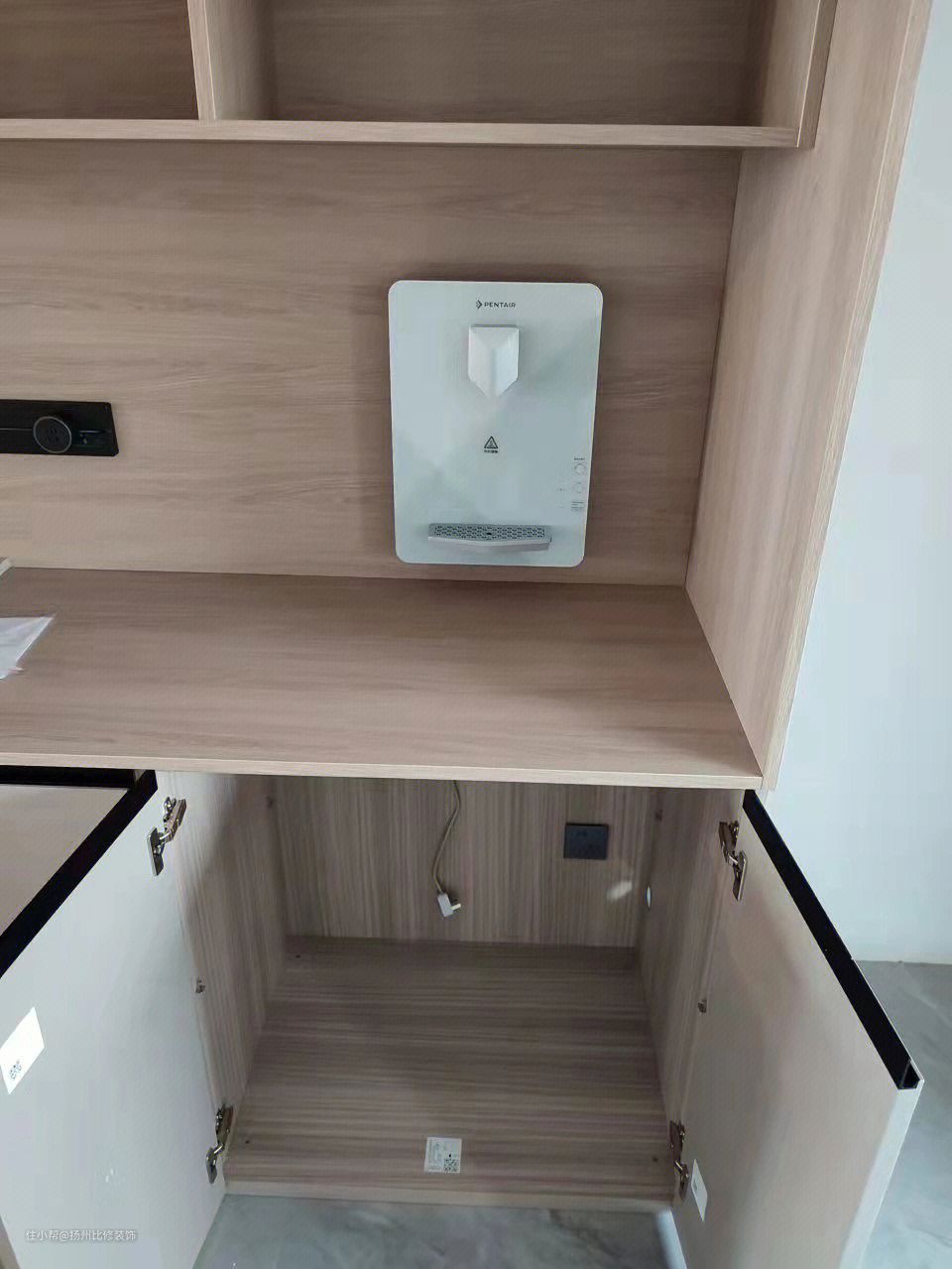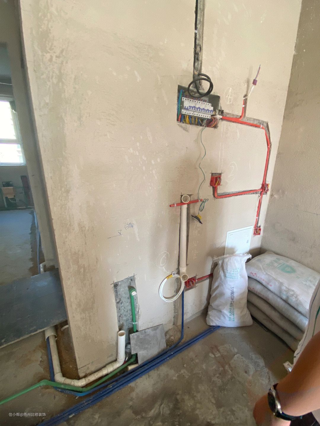 大家看明白没有?我们预埋一根40PVC管(就和燃气热水器预埋管一样),插座放在柜子下方,然后管线机挡着线和管子,再给大家看看工地实际预埋: