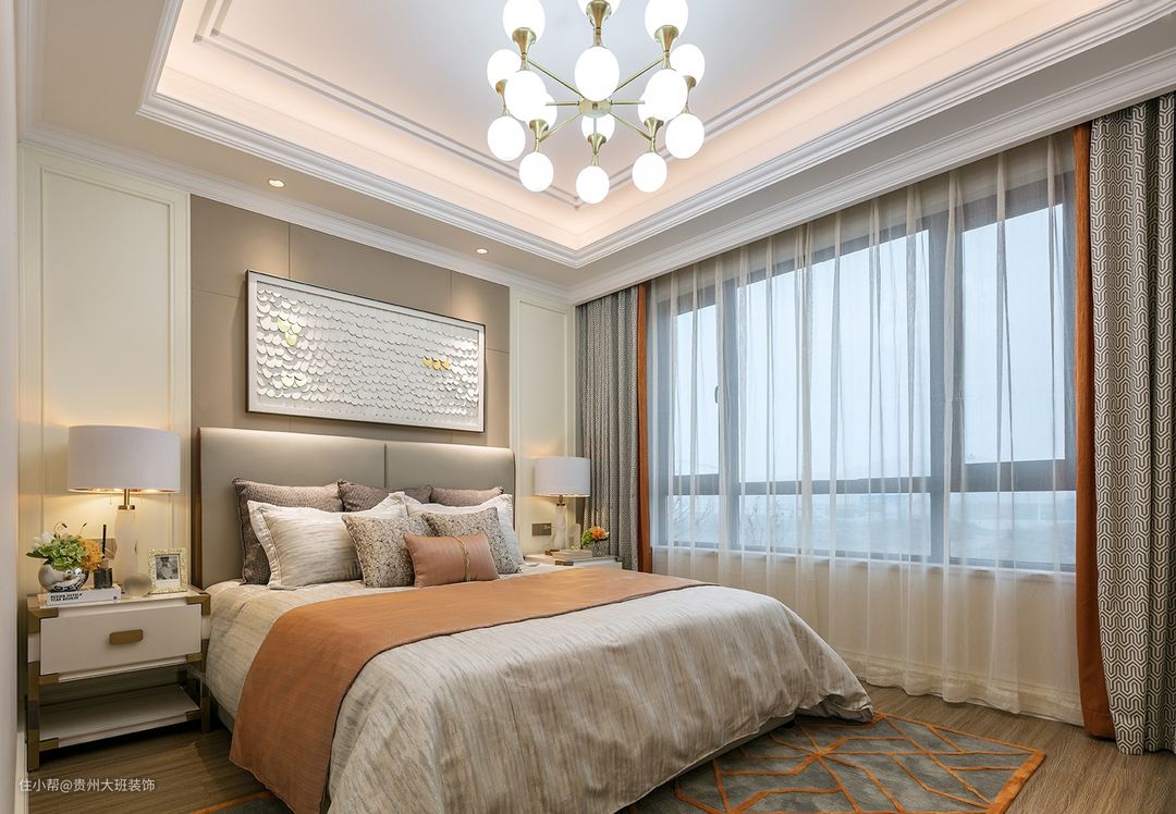 卧室延续客厅的颜色搭配,浅咖色的背景墙搭配奶白色在两侧增加墙面层次感,橙色窗帘点缀,让整个空间不显单调,暖色灯光让整个空间更加的温暖。