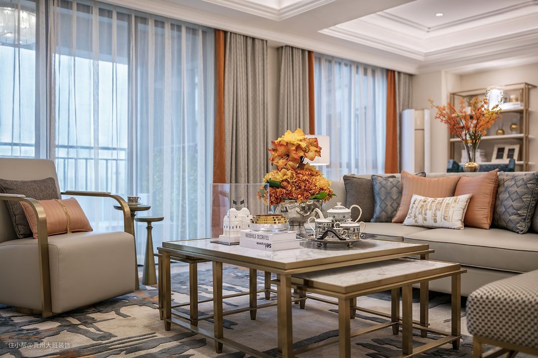 整体空间以奶咖色,米色,白色为主,在带有深色家具,橙黄色植物对比突出视觉效果,色彩丰富又不夸张,咖色的背景墙搭配奶白色在两侧增加墙面层次感,灰色的沙发花色抱枕,独特的地毯,在暖色灯光下温馨又大气