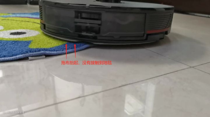 它很智能的及时检测到地毯就升起拖布支架,只对地毯做吸尘工作,待结束后,又将拖布支架降落继续扫拖。使用后我还认真看了看地毯,的确干干的没有水渍。