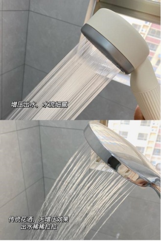 除此之外,它的出水孔也比较均匀且细密,而且经过了严格的科学实验,增压的效果明显,而且比较稳定,不会出现水流不稳,爆冲、水量小的情况。