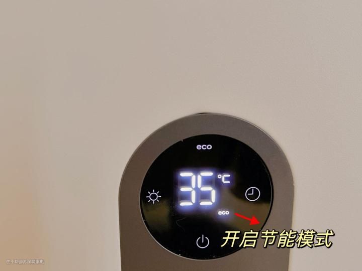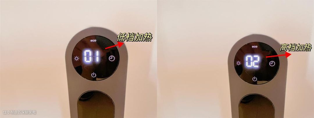 这款取暖器有三个取暖模式,分别是01低档加热、02高档加热,此外还有一个ECO智能控温模式。同时它还支持18-35摄氏度的定温取暖,用遥控可以升高或降低1摄氏度。