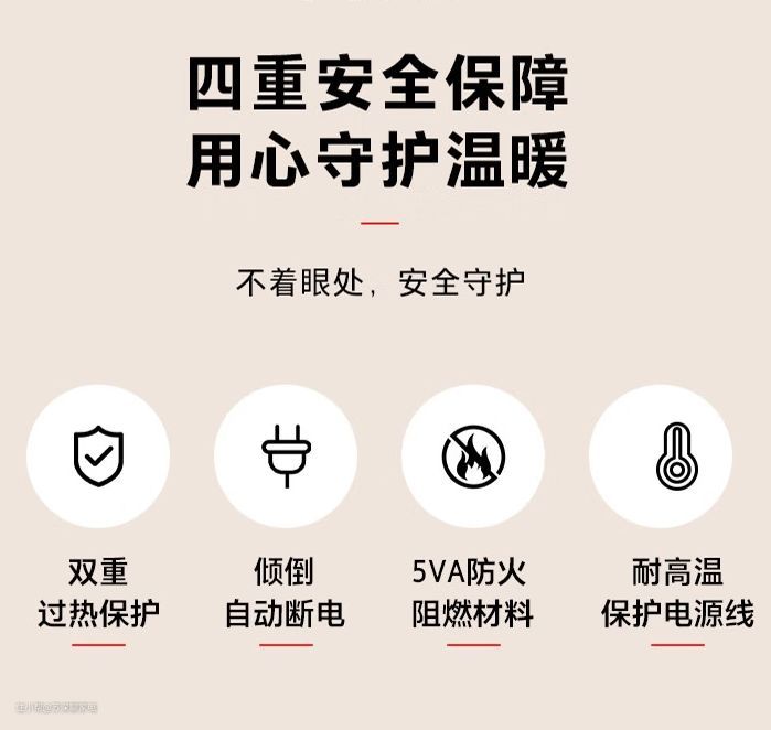 功能方面,两档设计搭配ECO智能温控功能,再加上循环送风的设计,几近于无的噪音,可以给使用者更舒适的体验。并且,长时间开着它也不会让室内变得干燥,不用配合加湿器也能使用。 安全方面,小和煦的外壳使用了两层隔热塑粉,开启速热模式时,取暖器外壳也不烫。并且,它的触摸屏周边也有做加强隔热设计,最大限度地提升使用体验。除了隔热设计,产品的其他安全设置也值得一提。小和煦有着双重过热保护、自动倾倒断电、5VA防火阻燃材料,耐高温保护电源线这四种安全防护。
