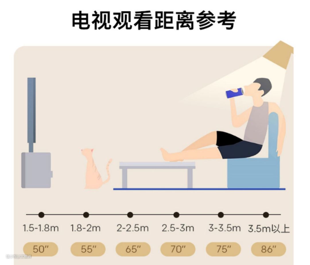 这里有一张“电视观看距离参考图”,大家可以根据观影距离的长短看一下自家适合多大屏幕的电视机。