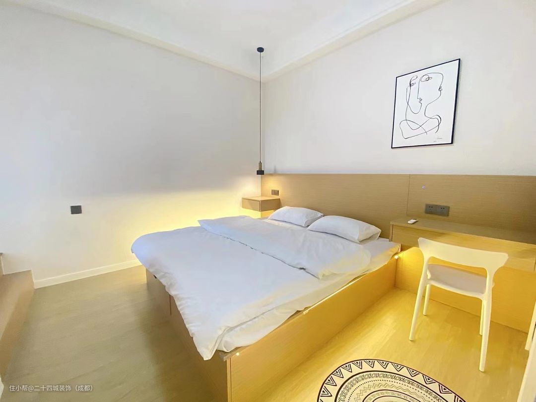 卧室衣柜到顶设计,从墙面和衣柜上延伸了两个床头台面,在床的边缘走了一圈灯带,暖意十足,非常好看又实用。收纳也足够。简单大方