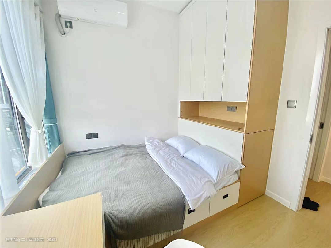 次卧是做的榻榻米形式接入书桌,一台蘑菇灯也非常温馨可爱。衣柜是中间留空的,方便晚上看书或者喝水可以有地方放置物品。