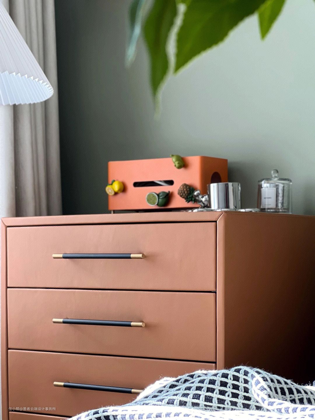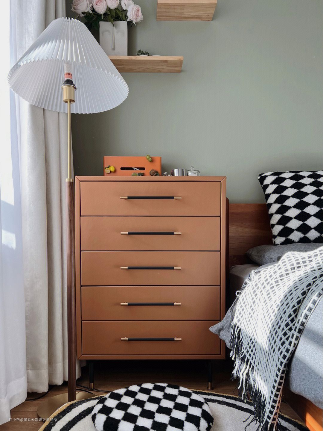 床头放了颜值有屋家的旅行者五斗柜,皮质细腻,颜色耐看,储物能力也没得说