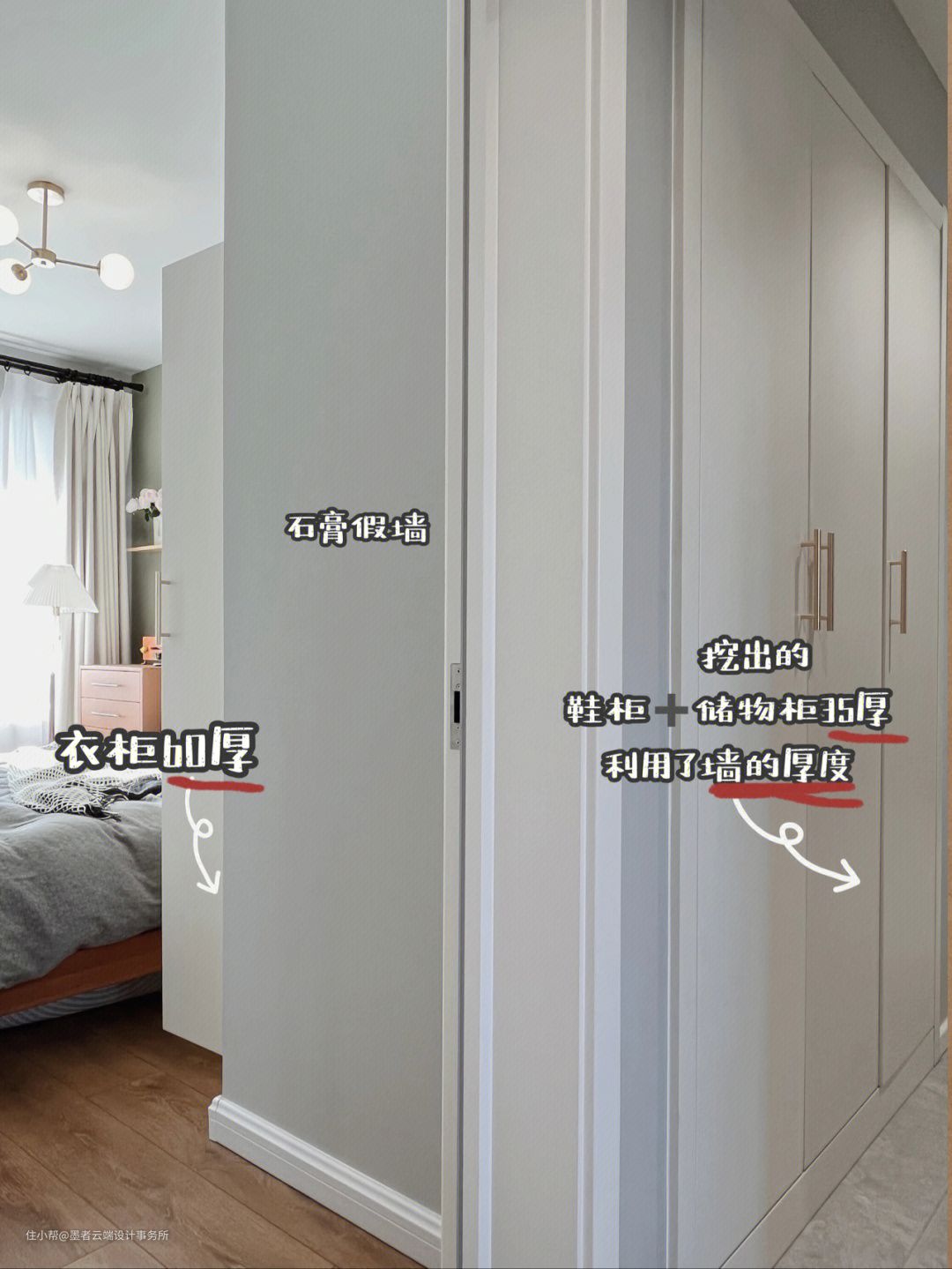 我把卧室靠近门这面的非承重墙打掉了,一面做了整面的鞋柜➕储物柜,另一面做了整面大衣柜,鞋柜的深度为35cm,衣柜是60cm深,两面柜子是背靠背的设计,刨掉打掉的墙的厚度,实际上也没有太占用卧室空间❗等到你入住新家的时候就会发现这个设计有多香啦~