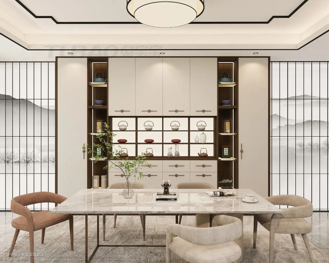 这是一款新中式餐边柜,呈两边对称。中间和两侧都有开放空间,主要用于装饰,上下及一门到顶的设计为封闭式,保证了收纳的功能性。