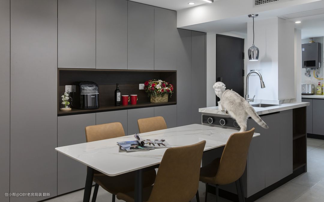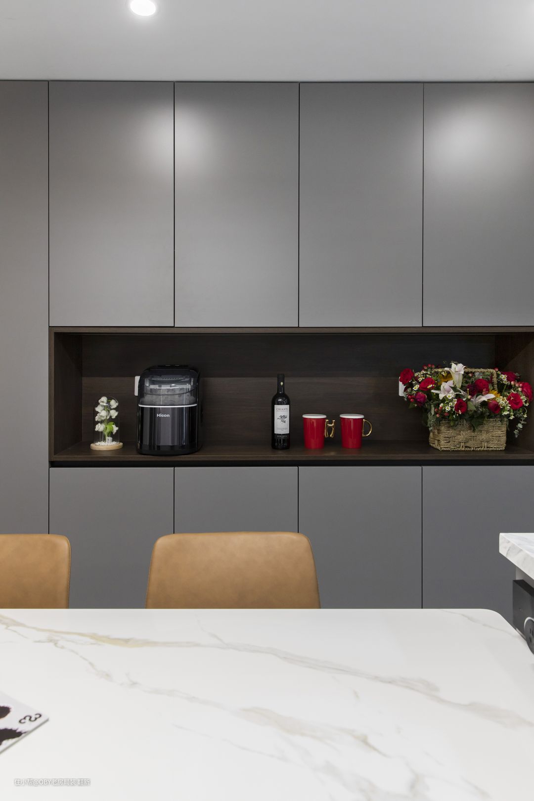 -整体钛金灰柜体设计使得餐厅区域设计感满满,现代轻奢感十足。为了削弱空间体谅弥补层高不足,灯具也选择了简洁的一字型吊灯,同餐桌齐宽,整体流畅完整性更高。