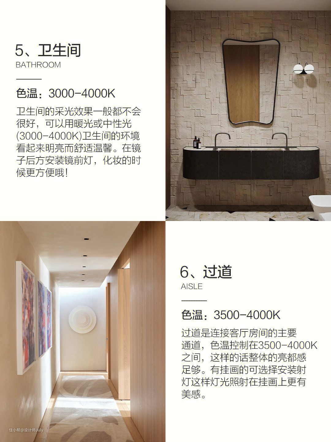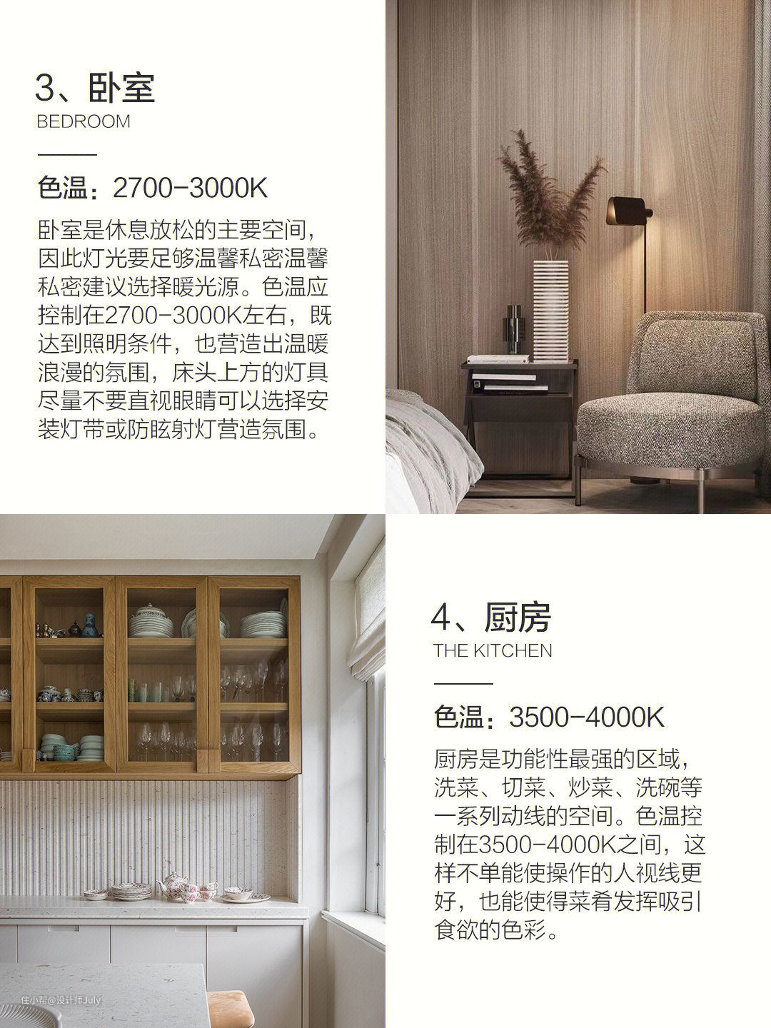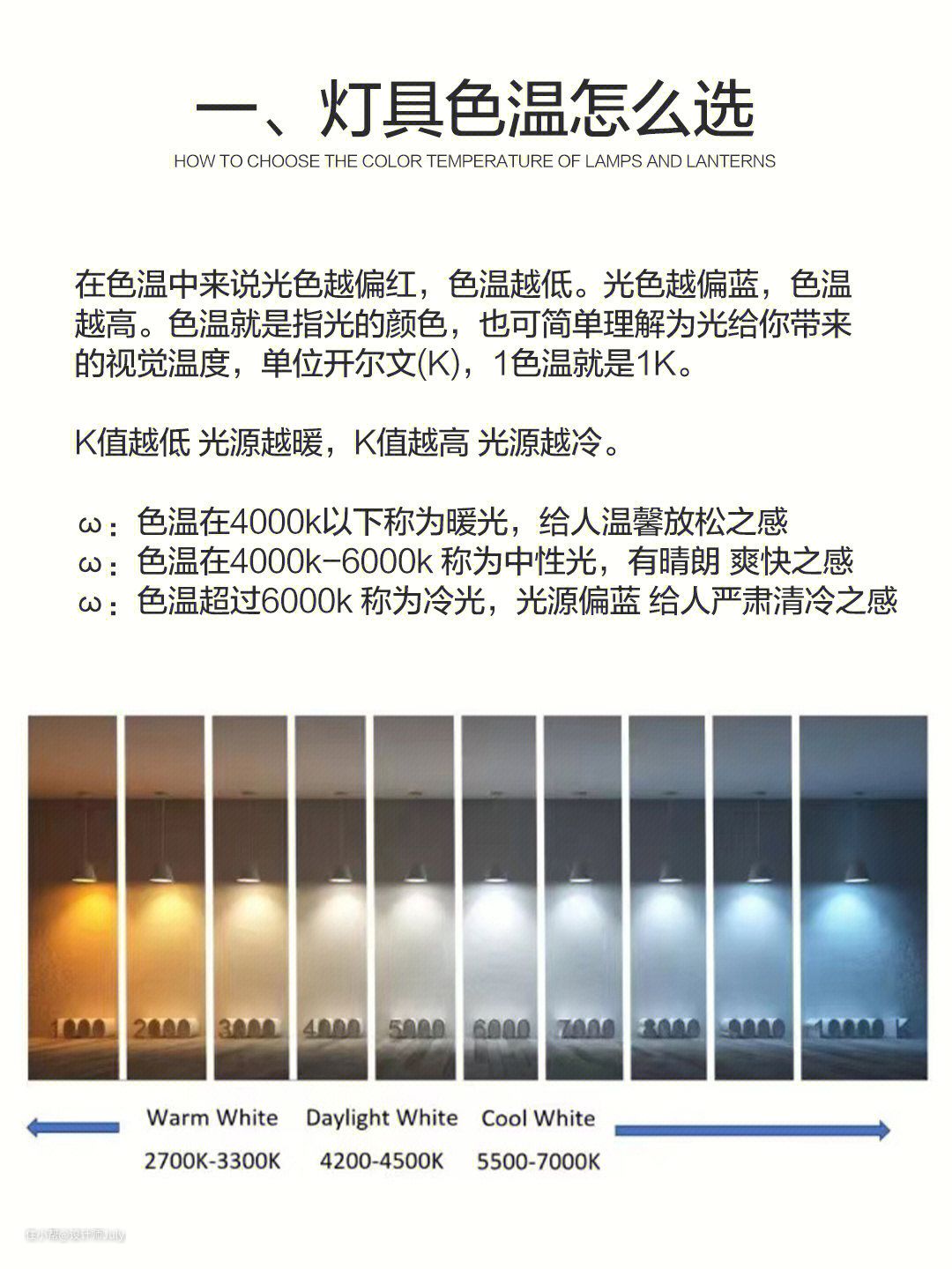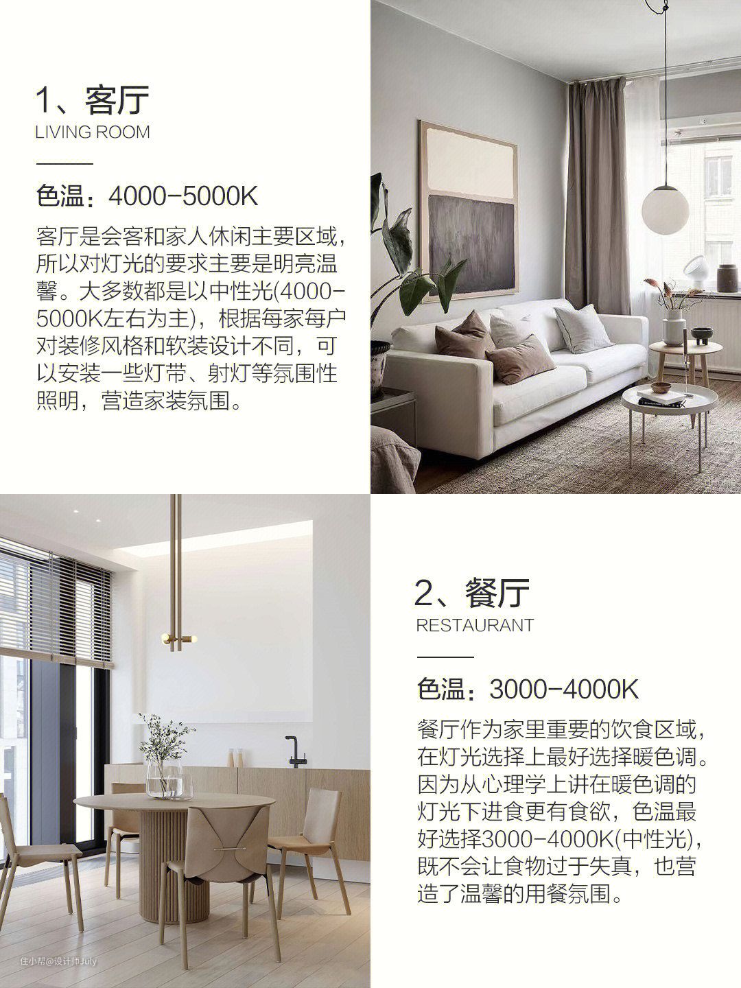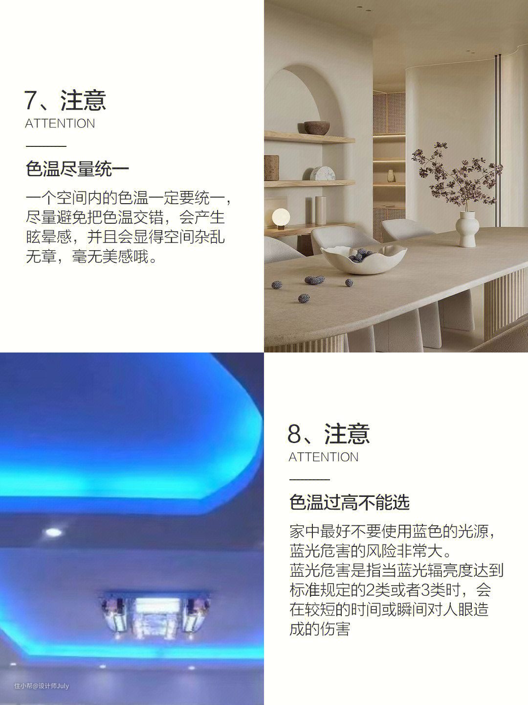 1、色温尽量统一,一个空间内的色温一定要统一,尽量避免把色温交错,会产生眩晕感,并且会显得空间杂乱无章,毫无美感哦。2、家中最好不要使用蓝色的光源,蓝光危害的风险非常大。蓝光危害是指当蓝光辐亮度达到标准规定的2类或者3类时,会在较短的时间或瞬间对人眼造成的伤害。