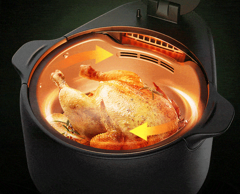 空气炸锅的核心其实就是高速空气的循环技术,利用发热管产生的热量,再使用大功率风扇提供的高温气流快速循环,与空气炸锅内部的螺旋结构结合,带走食物表面的水分,让食材快速脱水,产生酥脆焦嫩的口感,让食物呈现出类似油炸的效果。