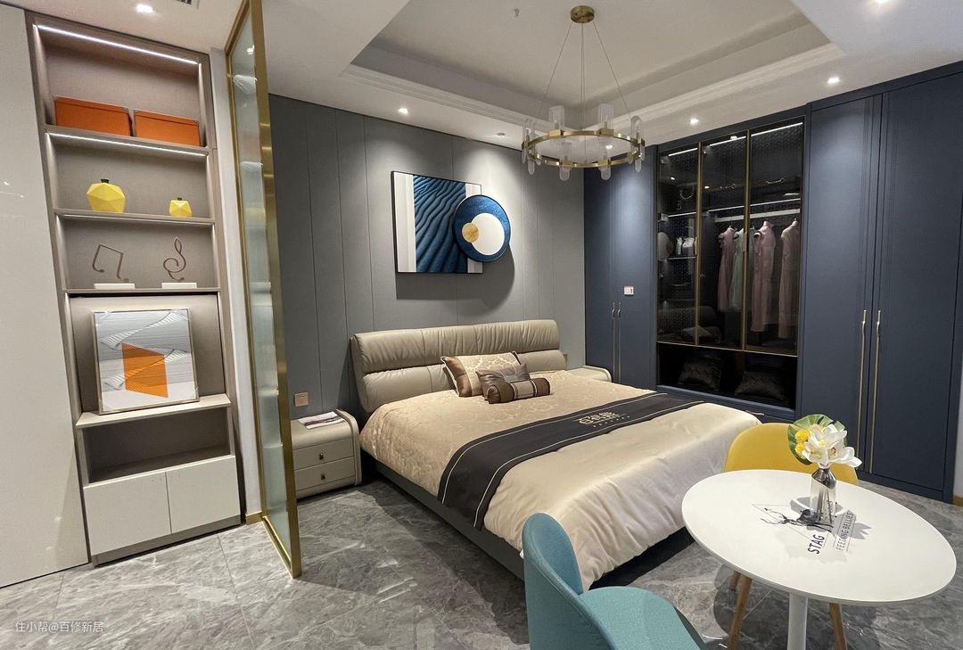 衣柜大了储物也不会杂乱无章,蓝色的柜面加上金属感的把手,高级贵气。中间透明玻璃门,具有质感透明,小空间更显得宽敞通透,不会给人沉闷的感觉。