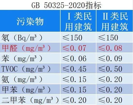 国家标准《民用建筑工程室内环境污染控制标准》GB 50325-2020对Ⅰ类建筑的甲醛要求是≤0.07毫克/立方米,Ⅰ类建筑是指:住宅、公寓、病房、教室、宿舍等。该标准看起来比《室内空气质量标准》的0.10毫克/立方米要求更严格,其实不然。