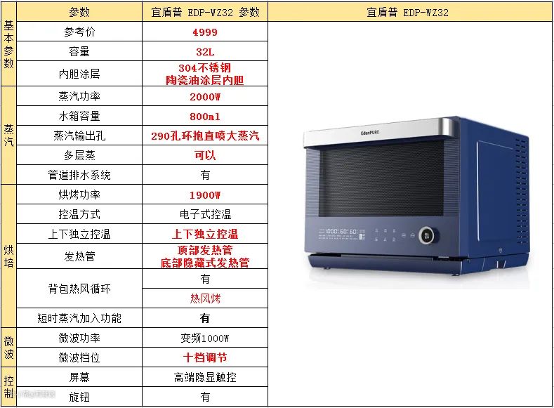 宜盾普EDP-WZ32微蒸烤一体机在蒸汽功能上特别有优势,蒸发器采用的是304不锈钢材质,不易产生水垢;背部有290 个蒸汽孔用来直喷蒸汽,配合背部的大风机带动蒸汽360°流动,让蒸汽快速环绕包裹食物均匀加热,保持食物的鲜味和口感。