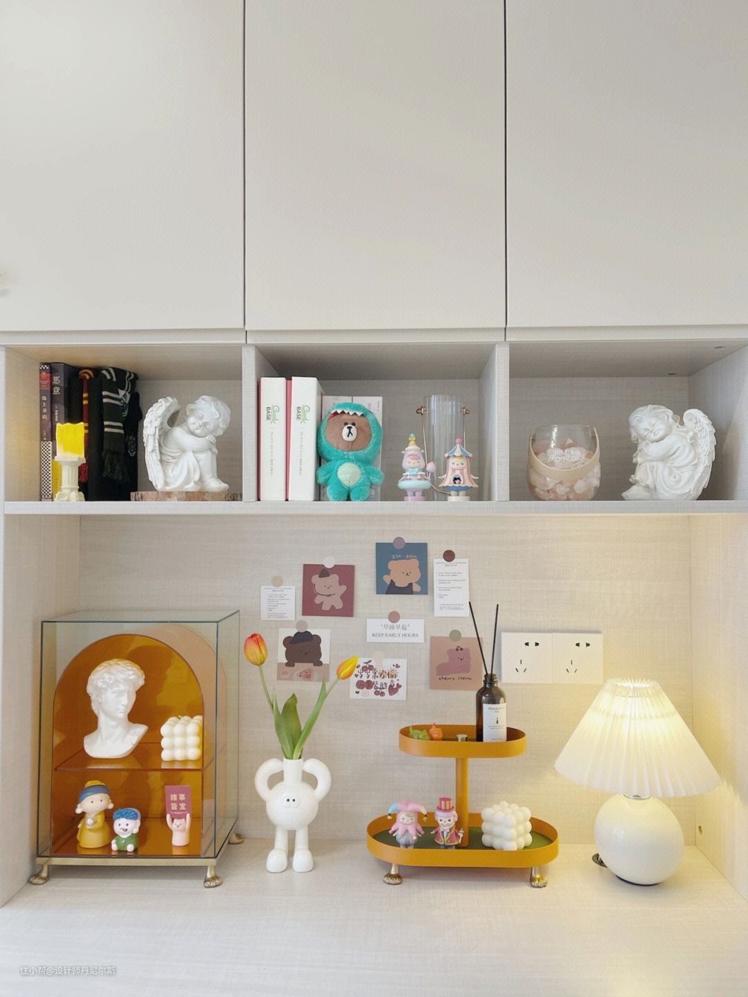 对于屋主来说,一个书桌还是hin有必要的,减去柱子120cm的长度不管是对于屋主工作还是以后孩子🏻学习都很合适啦~我的书桌深度做的比较深,放了一个好看的置物架,给屋主的手办们找了个家~
