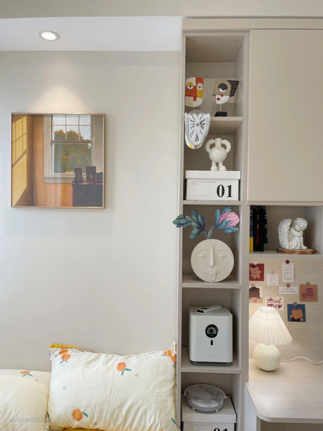 榻榻米旁边的开放格刚好可以放花瓶,投影仪还有小夜灯这些小东西~