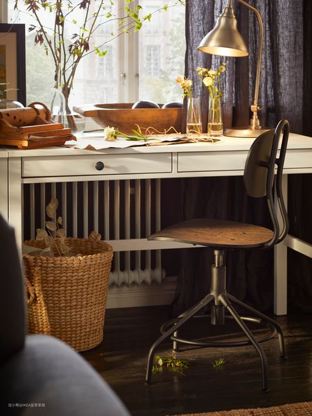 在窗前光线最充足的地方,摆一张汉尼斯松木书桌,搭配一只老式工业风格的转椅。窗外冷风席卷着萧萧落木,窗内却能温暖如同春季。