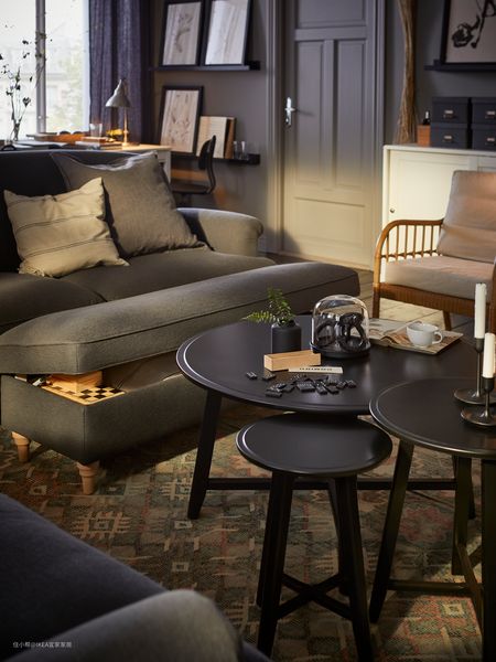三张克拉思塔茶几在客厅如何分配呢?你可以把它们聚在中央,变身高低错落、别有设计感的套桌;也可以单独把小茶几拉到沙发前,方便为你“端茶递水”。