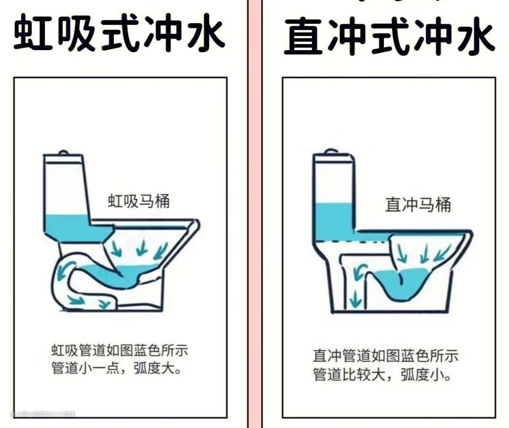 虹吸式马桶管道结构呈 S 型,利用充满水之后的压力差产生吸力把污物吸走,可以轻松冲掉黏在马桶内壁的污渍,存水面积大,防臭效果好,冲水声音小