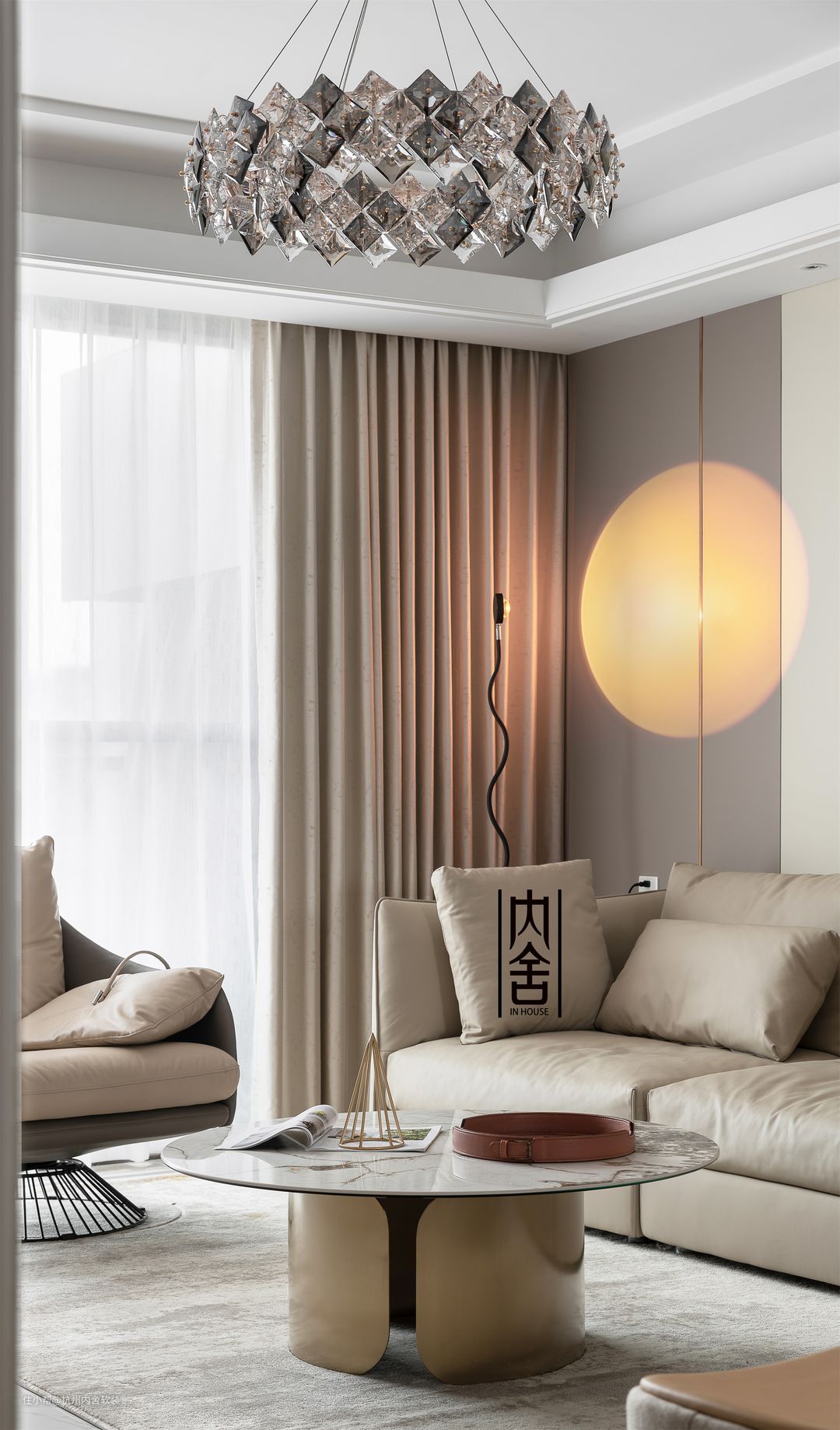 客厅以现代风的空间布置,加入时尚的石材、木饰面,搭配上奶咖色绒面沙发、大理石圆形茶几,营造出一种时尚优雅且高级的空间气息。