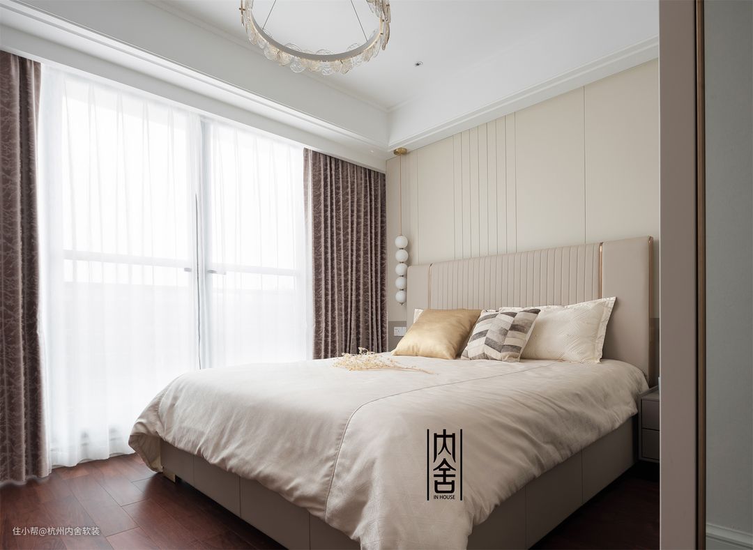 主卧延续整屋的现代轻奢风格,背景墙采用拼接设计,线条感增添空间层次感。金属材质的加入提升整体品质。