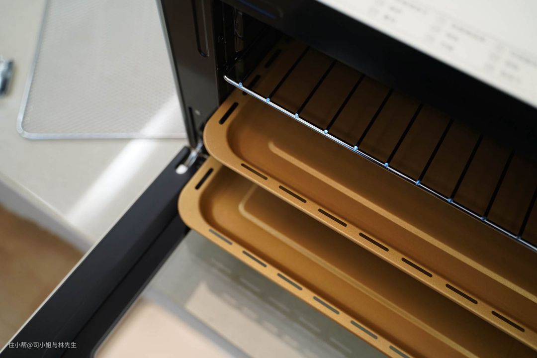 大白鲸搭配了我们常用的接渣盘,烤盘,烤架等配置,而长帝S1这是搭配了金色的不沾烤盘。这款金色的烤盘用料十足,食品级环保水性涂料双层喷涂加固,导热均匀,食物上色不过重,不粘易清洁。表面增加了防刮耐磨层:可耐受5000次实验室,耐磨测试不脱落;0.8mm加厚碳钢:抗压性更强,坚固耐用