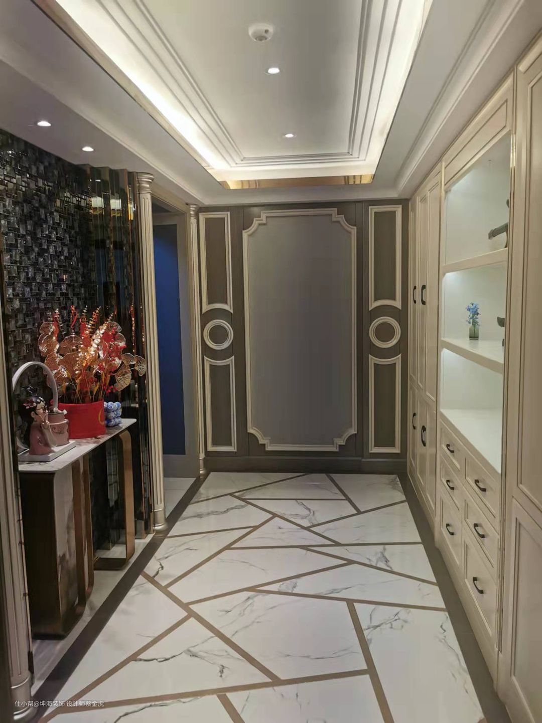 图片的玄关设计来自与欧式轻奢风格别墅的装修实景。不规则地砖造型与华丽背景墙,营造梦幻般装饰效果。