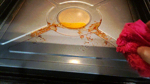 烤完牛排后,蒸烤一体机的底盘上留下了一些肉汁,已经凝固了。这台机器是纳米陶瓷内胆,我也就顺便测试了一下清洁难易程度。