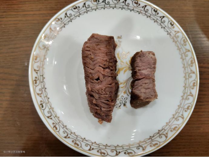 没有使用嫩烤模式的那块牛排明显缩水变老了,吃起来十分费牙。