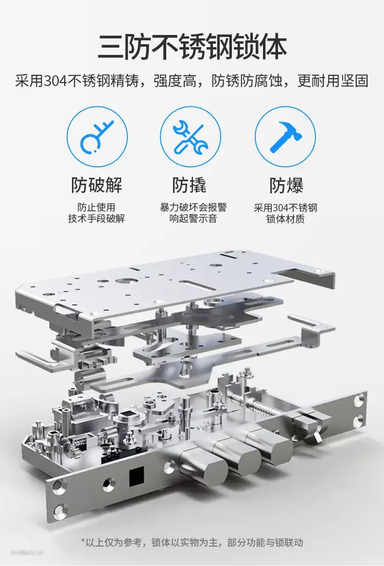 不锈钢材质坚硬,不易变形,有利于锁体内部结构的保护。铝合金材料相对来说抗冲击能力较弱。比如飞利浦智能锁体上下盖采用不锈钢材质,表面镀锌处理,具有优异的耐腐蚀、耐高温、耐冲击性。锁体传动部分采用不锈钢材质,具有优良的防锈性能。