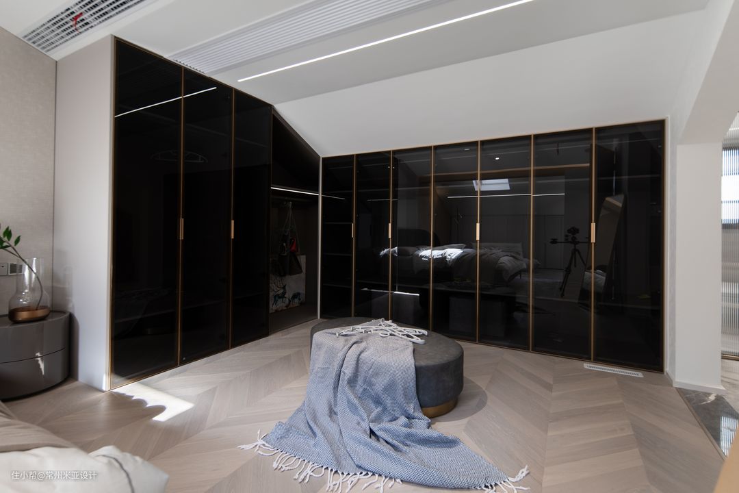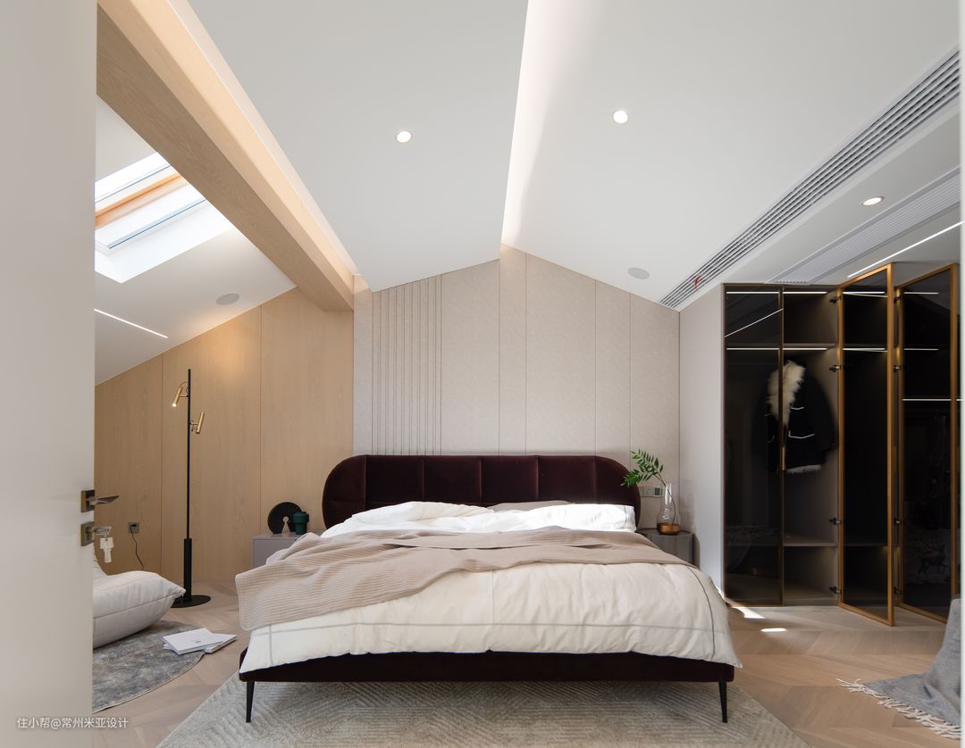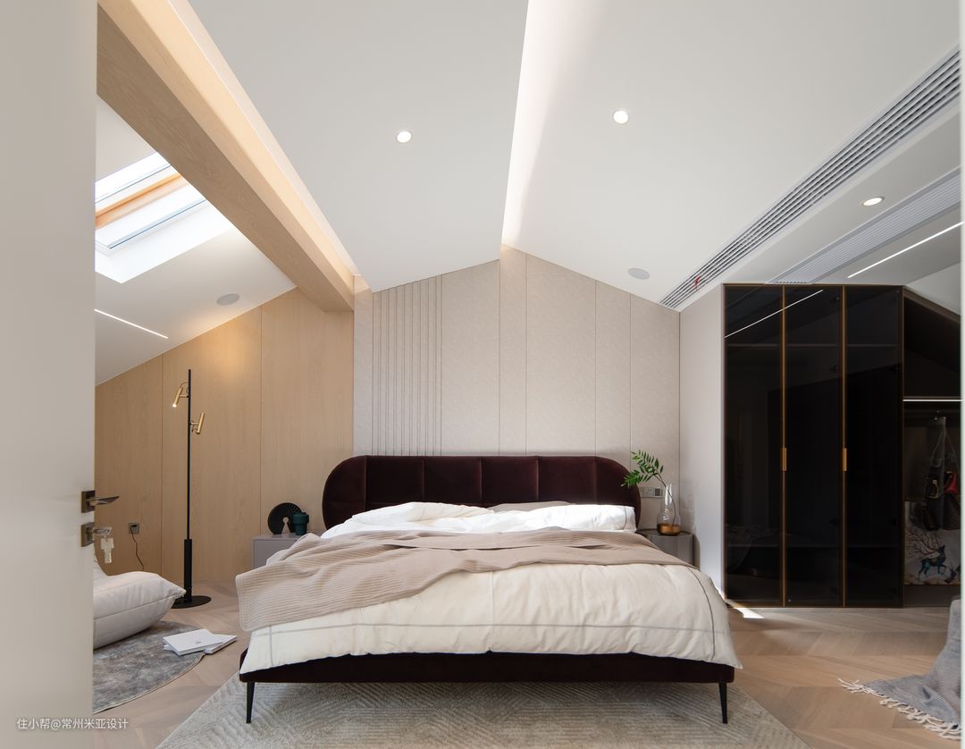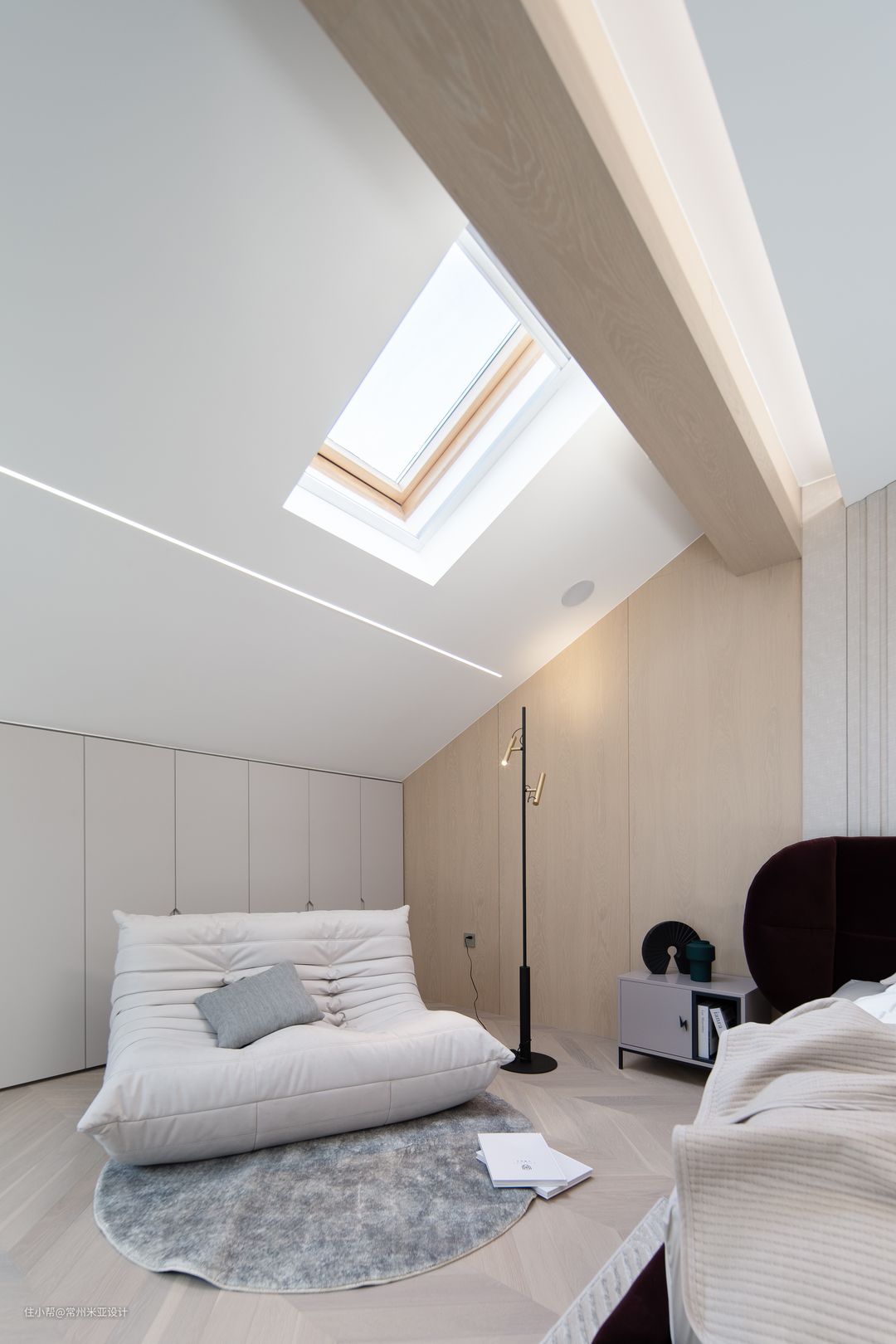 三楼是顶楼也是阁楼,同样作为居住空间,是业主本人最为喜欢的主卧室。顶楼带有天窗,当阳光透过天窗缓缓洒下来,一寸寸阳光铺满整间房,一天的好心便由此开始。敞开式的衣帽间,配备自动感应灯,人性化拉满。