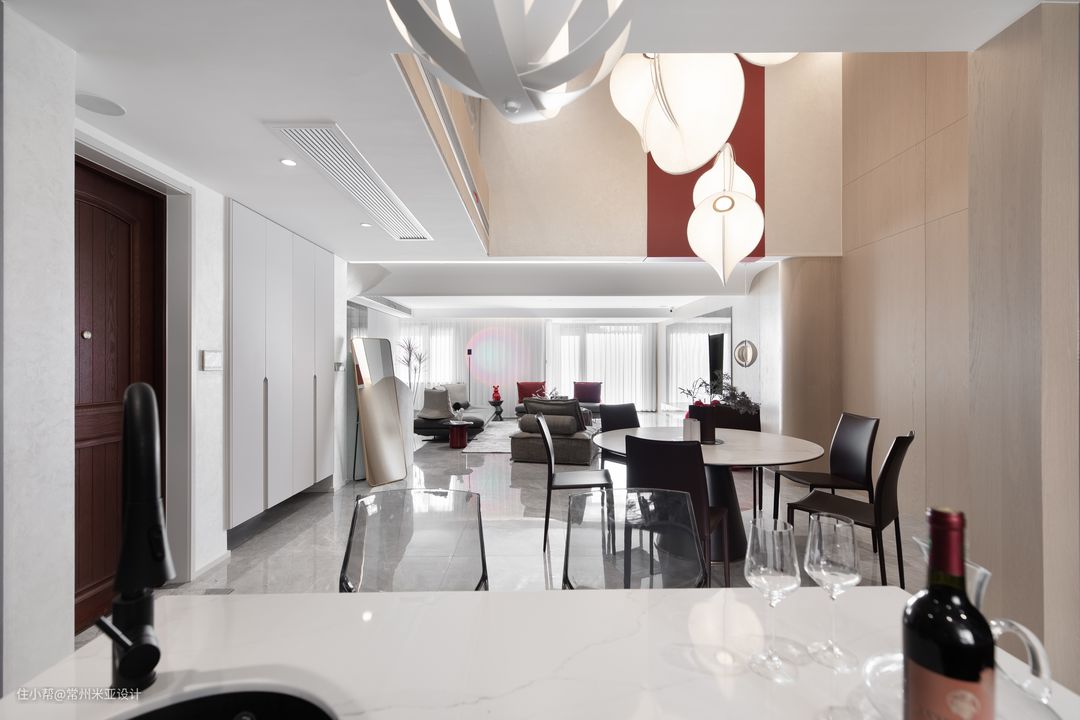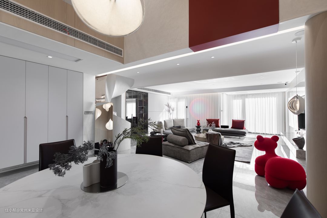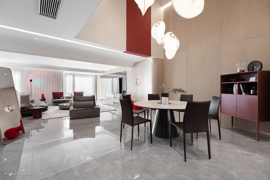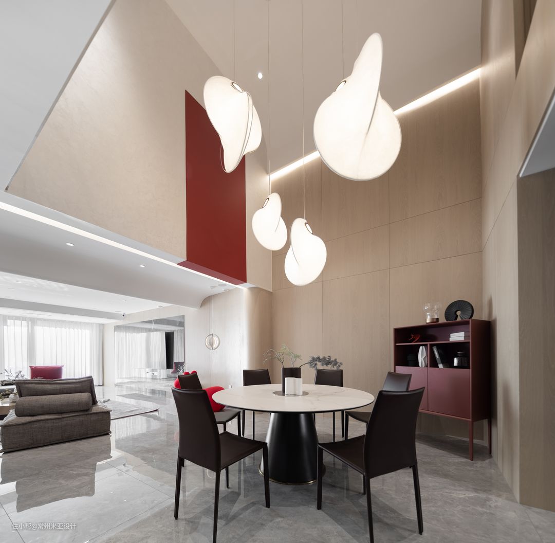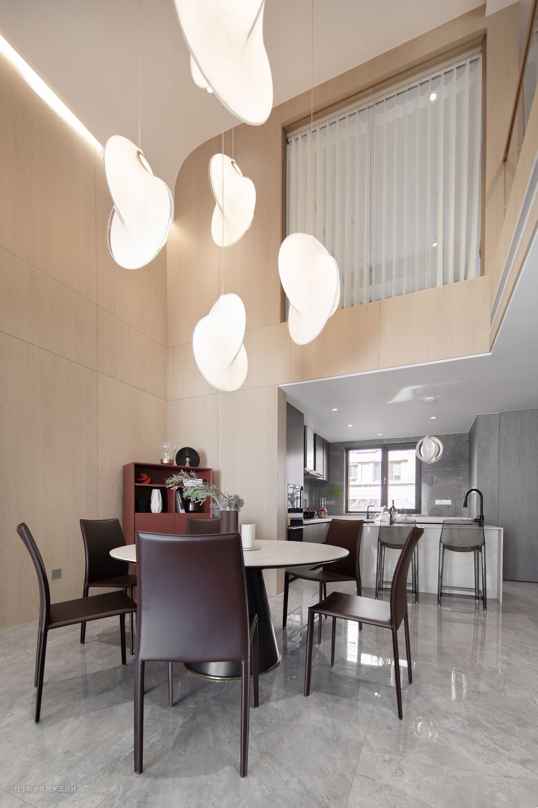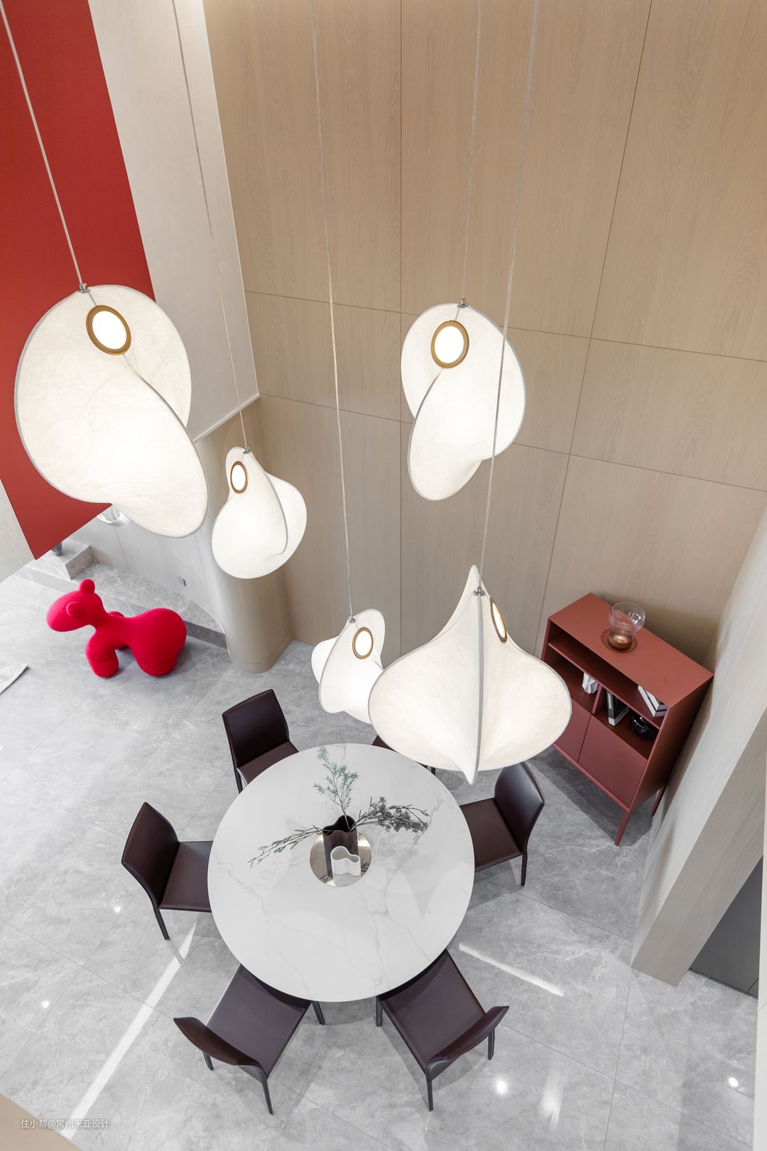 不仅是敞开式客餐厅。餐厅的设计独特别致,打通了上下楼的墙面,做的5.8米的挑空设计,使之与各个空间互相连接,产生互动。餐厅的蚕丝吊灯是唯一一个主灯,赋予整个空间别样的浪漫与温柔。
