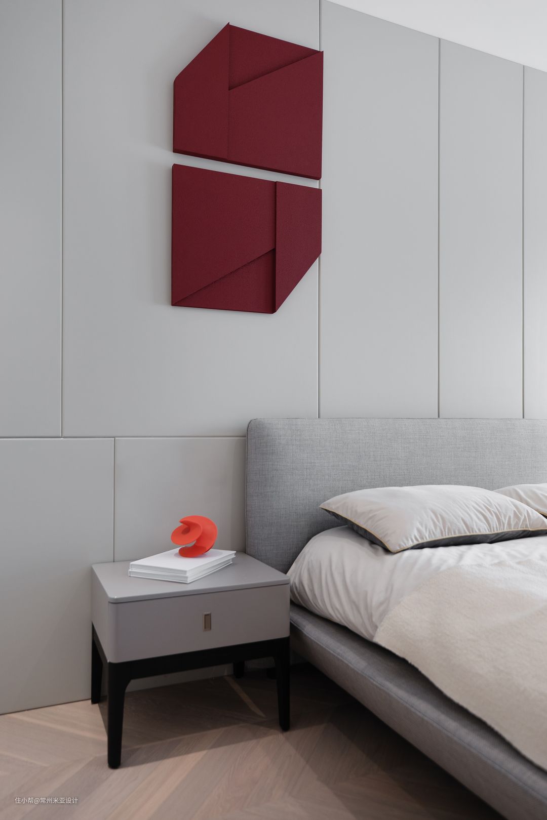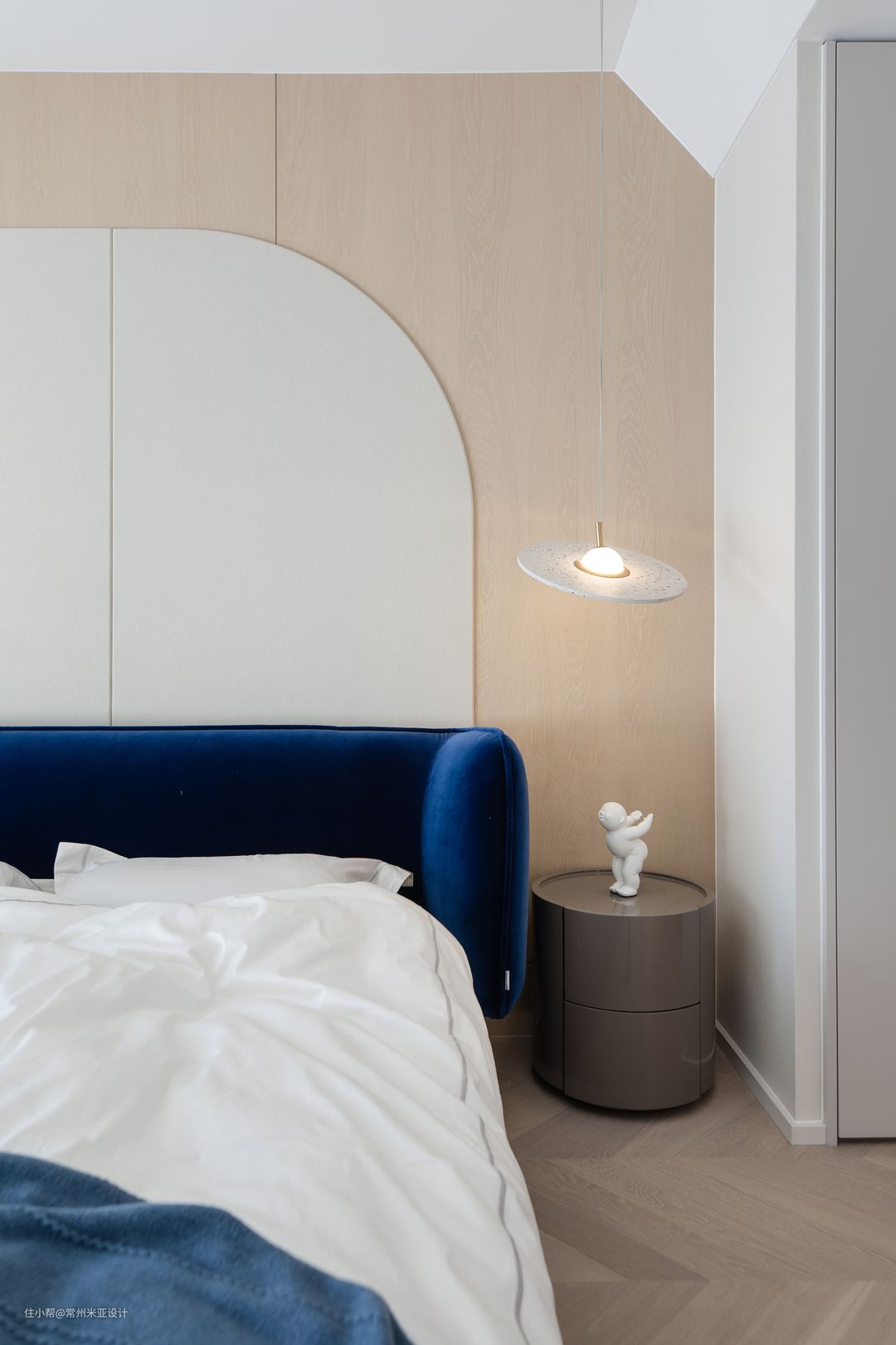 二楼作为主要的居住空间,父母房和儿童房以及日后的书房等均在于此。而这间的父母房大胆的用了深蓝色为亮点,与整体的浅色地板、木饰面和家具形成色彩碰撞,亮眼吸睛。