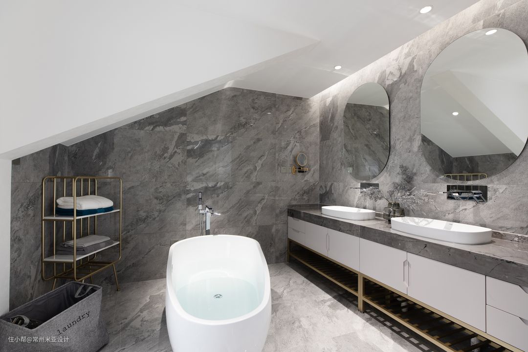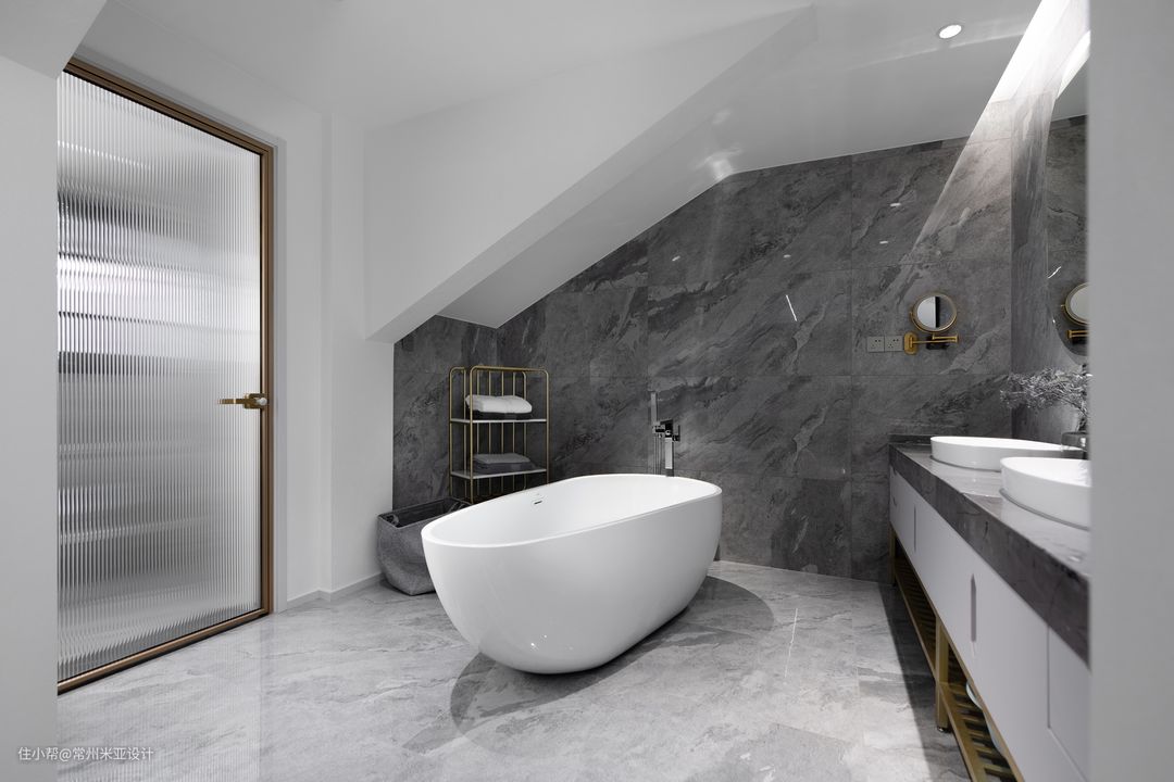 敞开式内卫与主卧相连。地面及墙面用0.6m*1.2m的地砖铺就而成,而洗漱台则是大理石材质,使得整个内卫空间明亮透彻,精致不减。