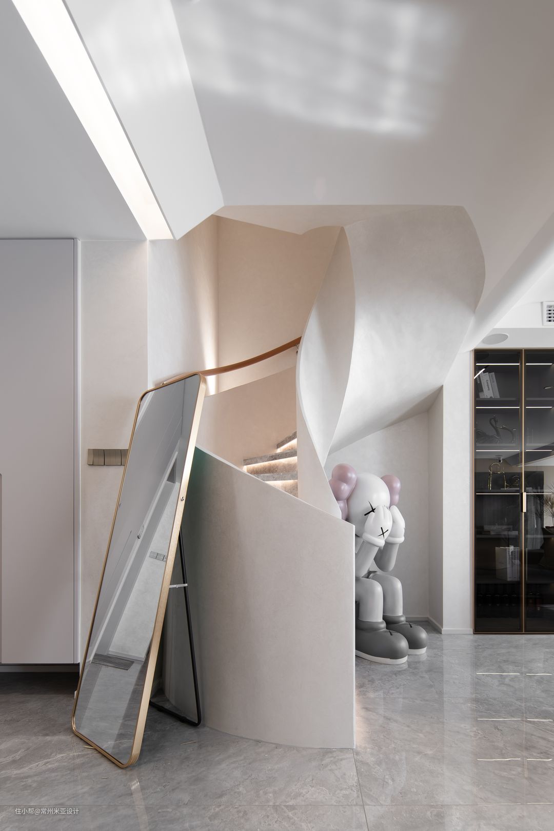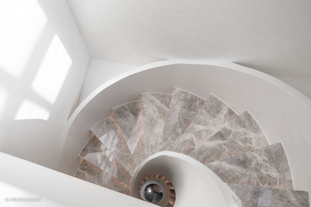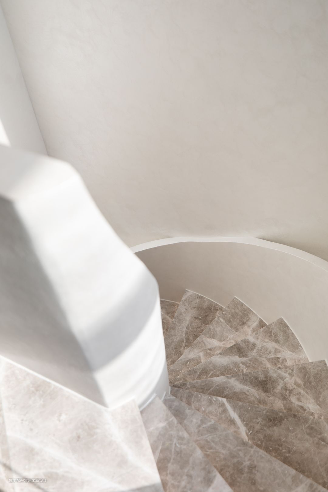 设计的方式总有不同的呈现。敲除正常的双跑楼梯改为旋转楼梯,提升空间感。脚踏楼梯而上,仿若印证生活也在缓步前行。