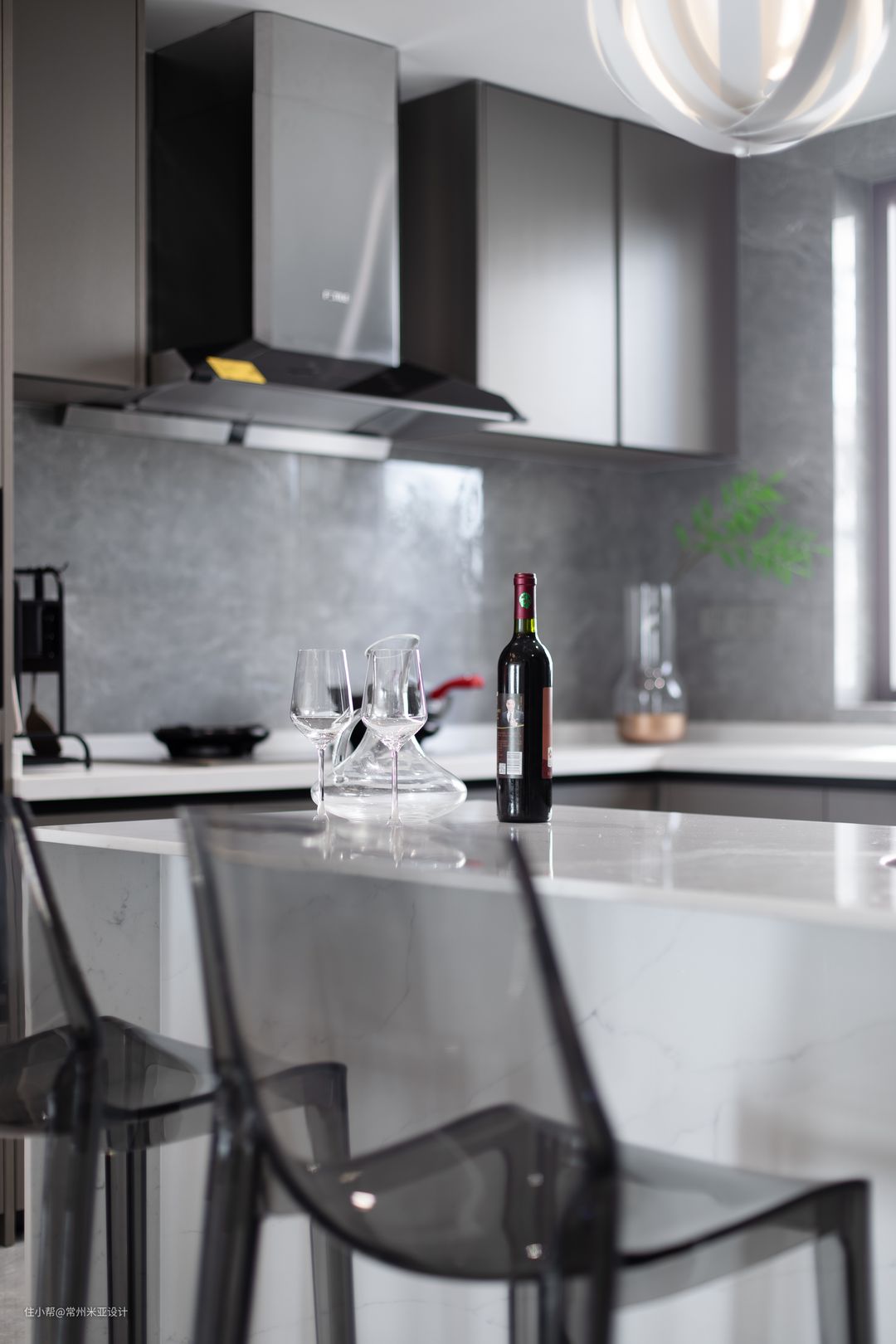 开放式的中式和西式厨房。充分利用厨房空间,做的隐形门的冰箱和嵌入式的微波炉、蒸烤箱,满足日常的基本需求。
