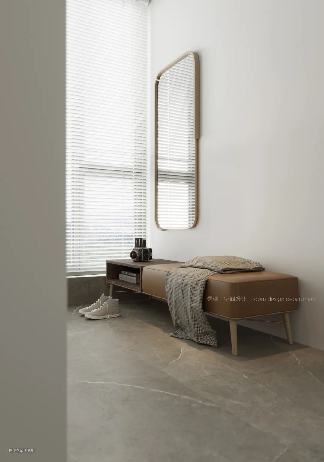 入门左边则就是鞋柜,安置了一张长椅,方便出门时穿脱鞋,还配有一张全身镜