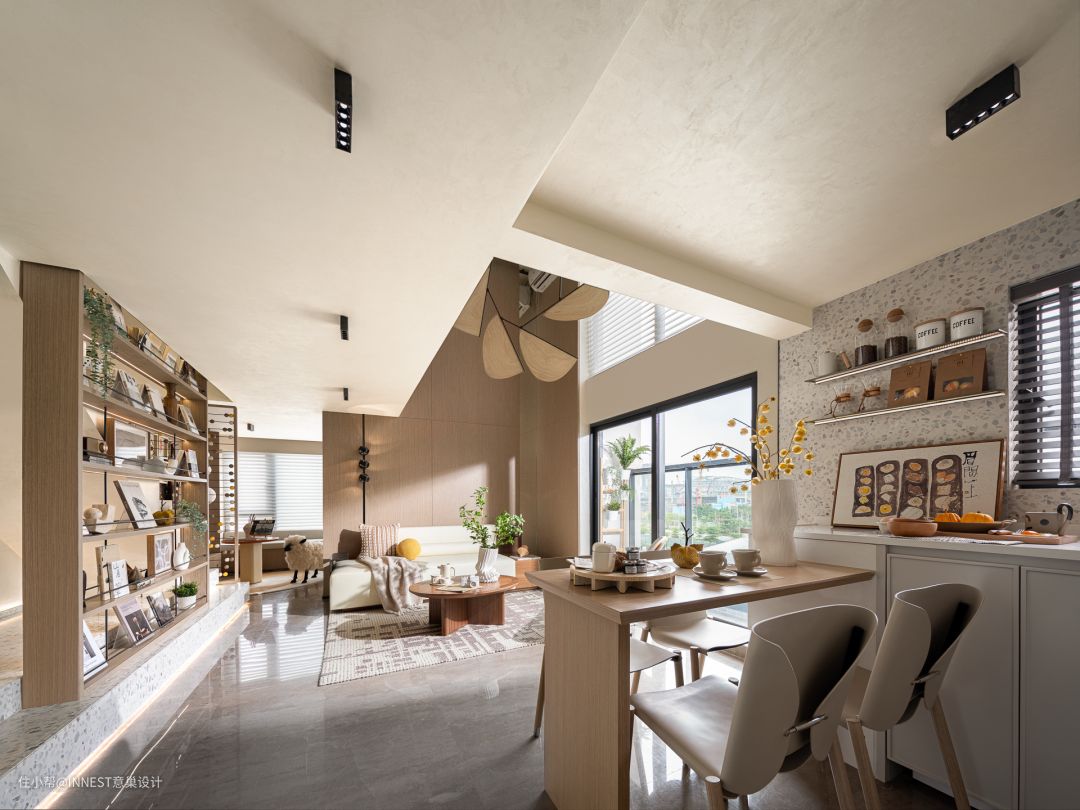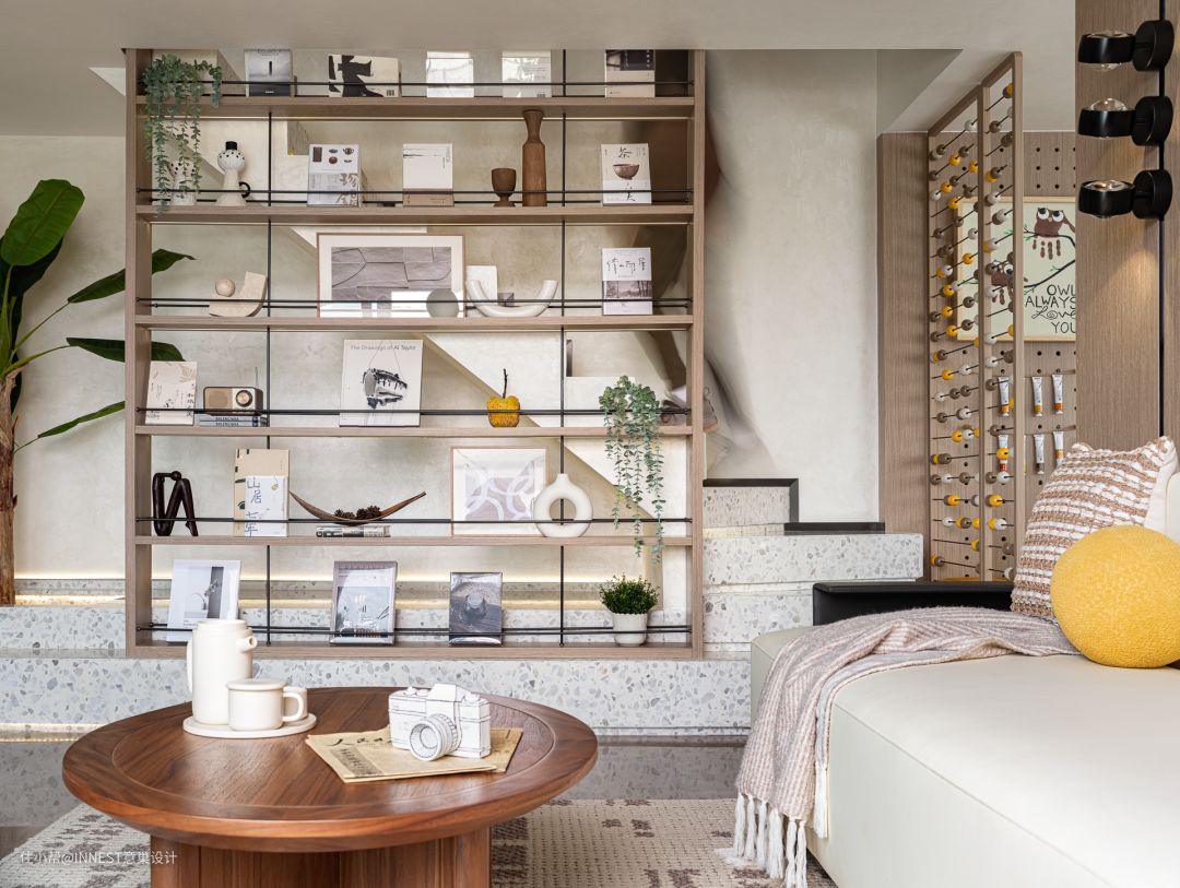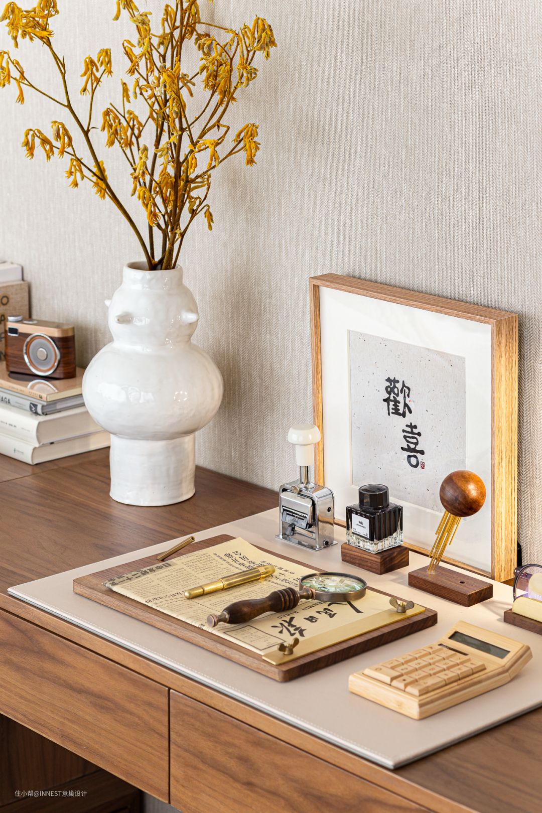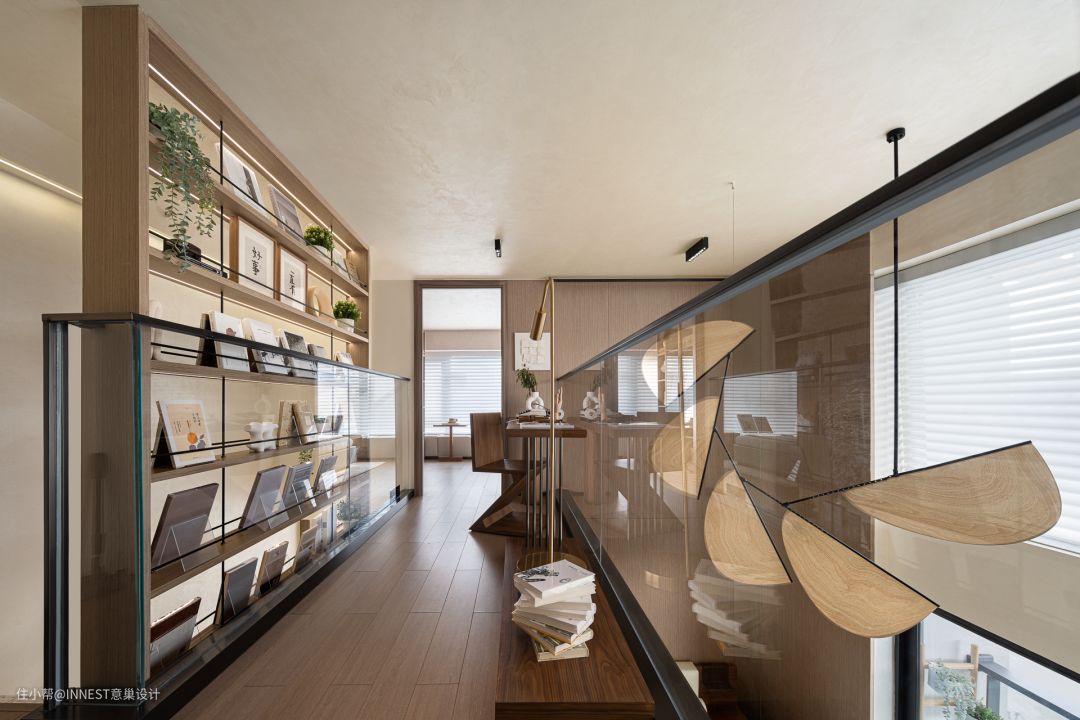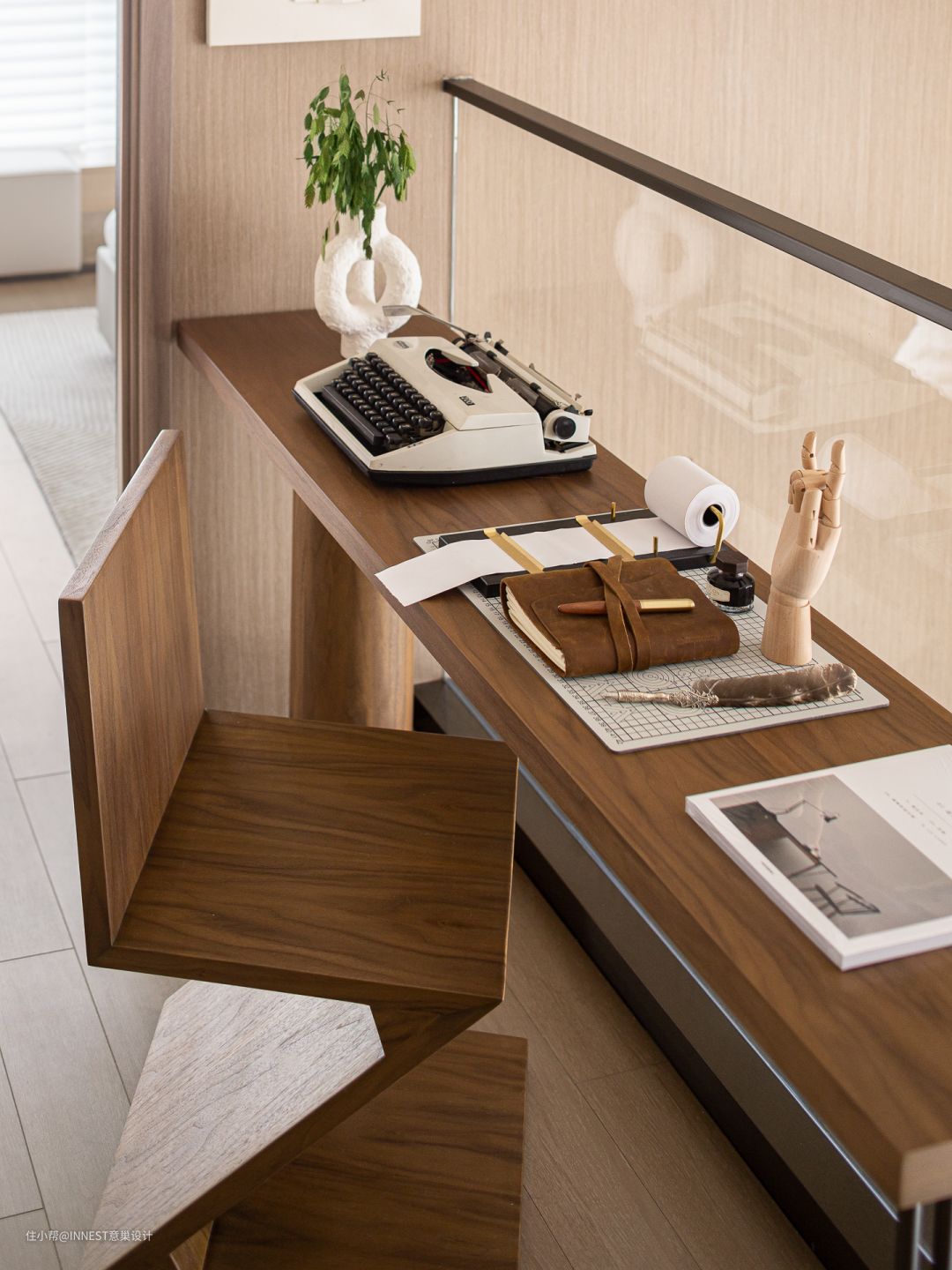 沿着楼梯扶手上行,二层过道则是男女主人的办公区,闲时便是夫妻静享二人世界的时光。