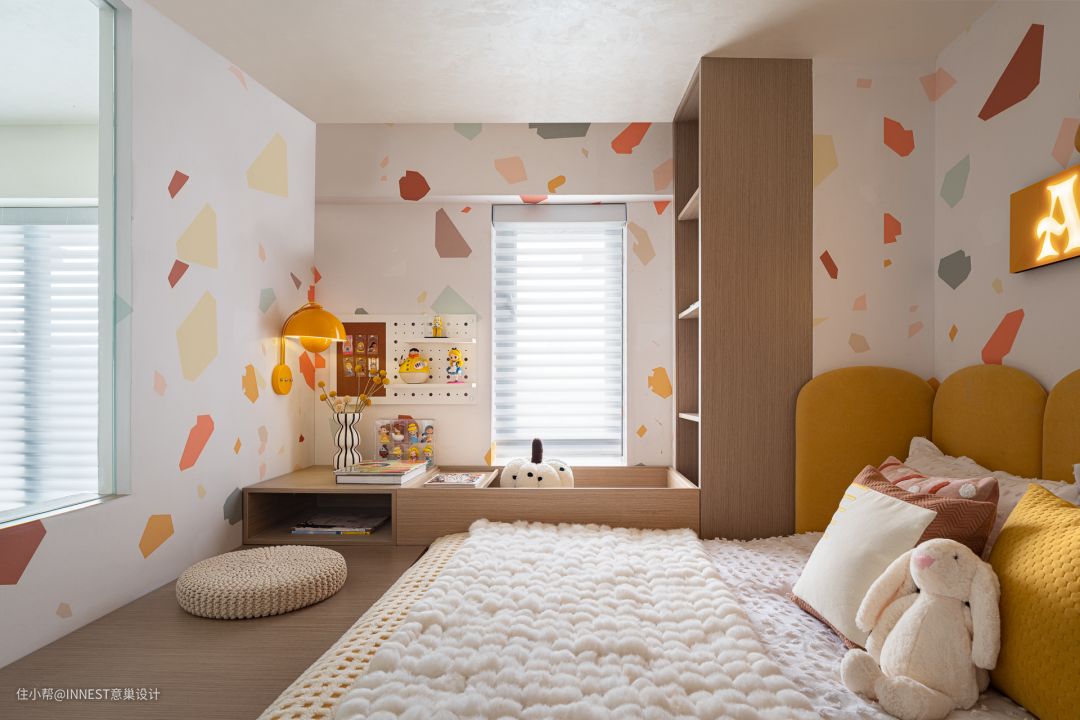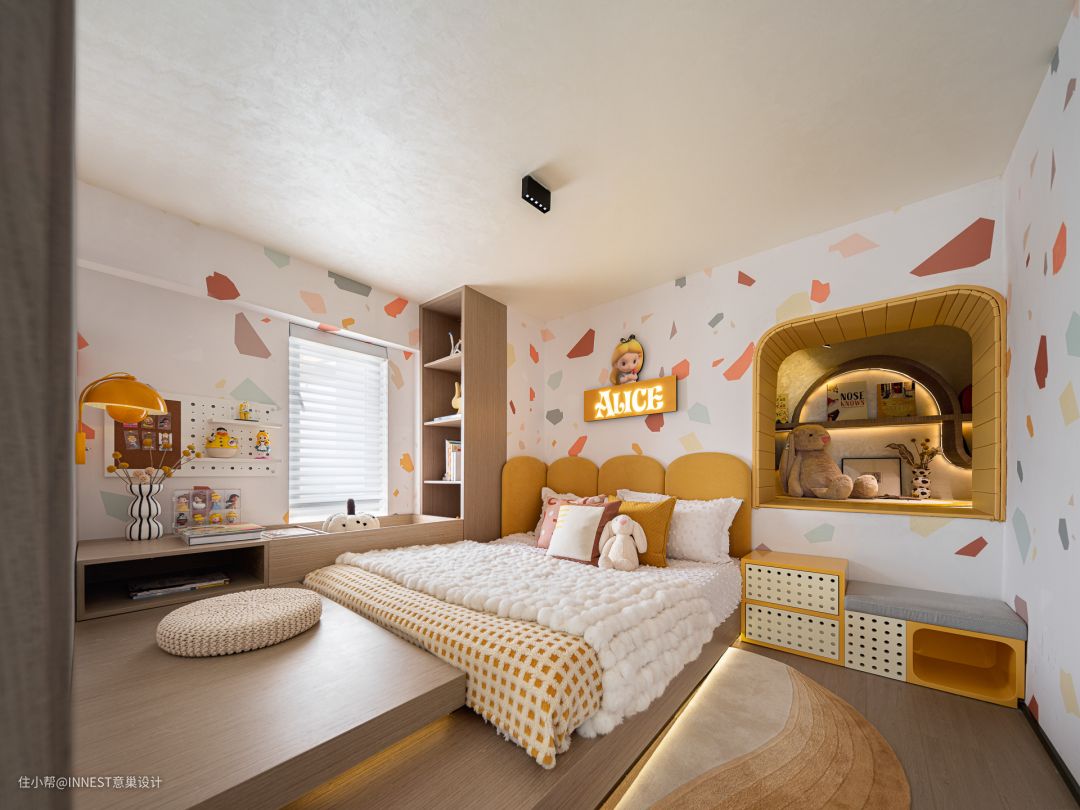 进入爱丽丝的梦幻树洞,这里收藏了各种儿童绘本和爱丽丝手办玩偶等,这是只属于孩子的“童话屋”。床的侧边则是打造了一个手作区,开发孩子无限的创造力,同时增设了收纳功能,储存一些她最爱的小玩具。