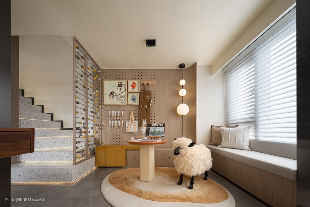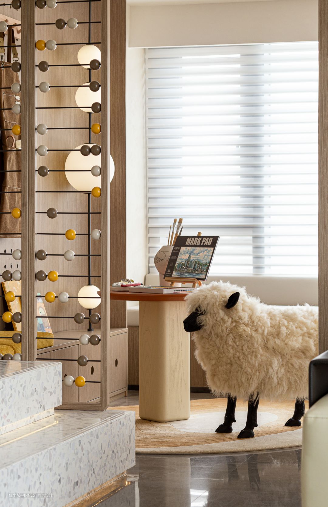 在闲暇的时光里,儿童活动区作为陪伴孩子的一个互动空间,使家庭氛围更加的温暖和舒适。为小孩提供不同材质的画纸画笔,满足她的探索欲望,将画画视为游戏的一种,享受手部运动带来的涂鸦快感。