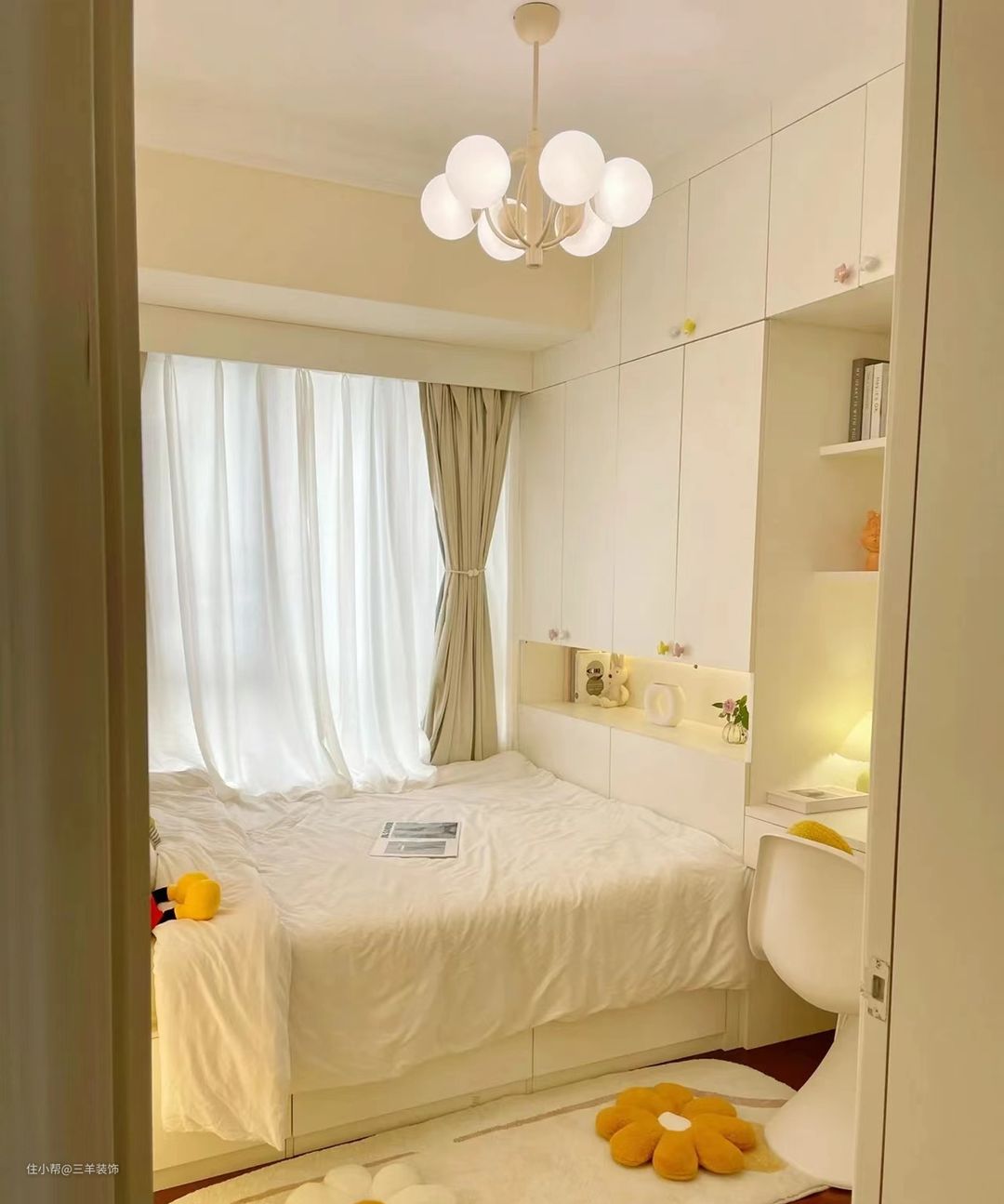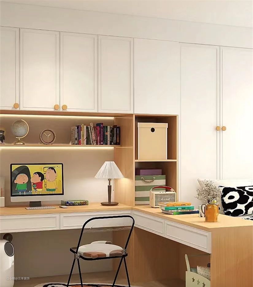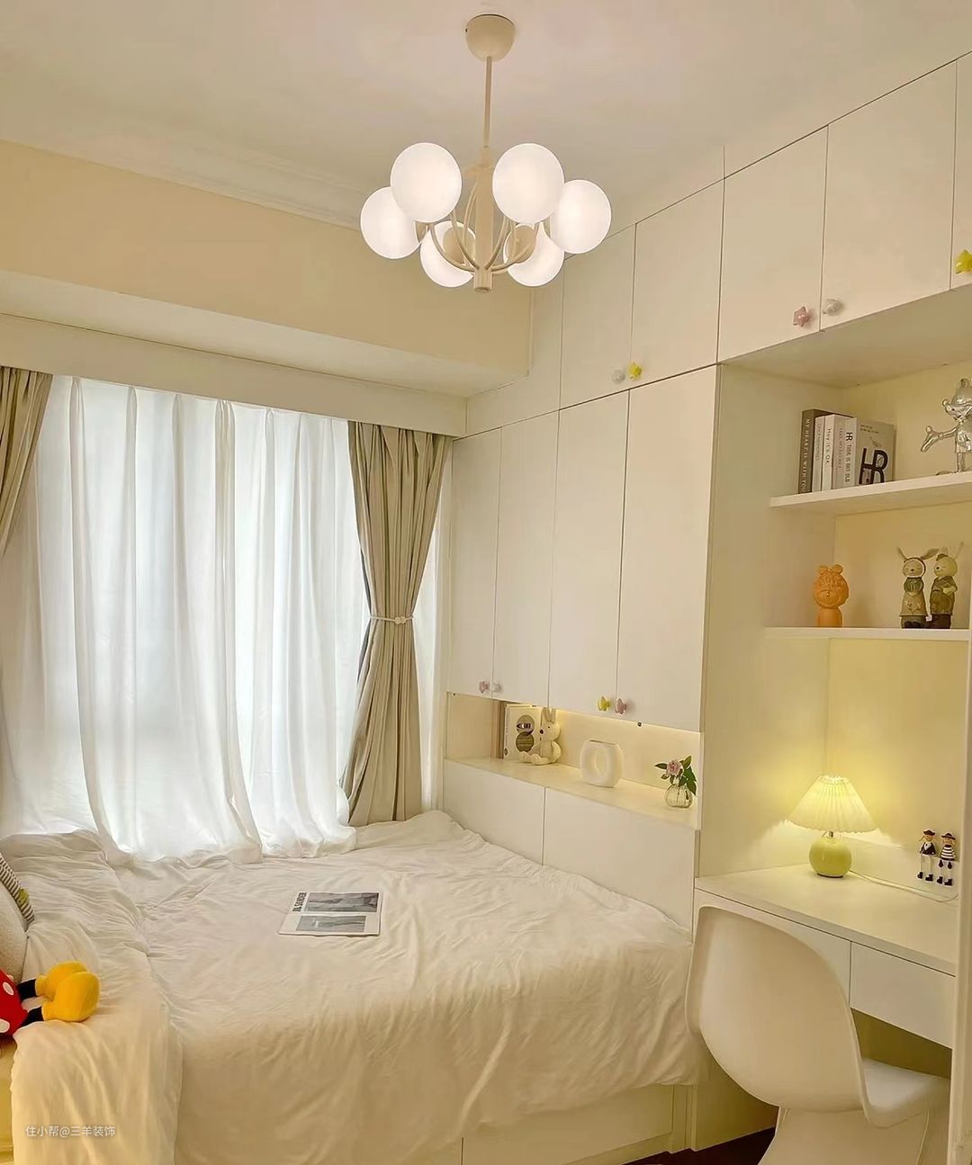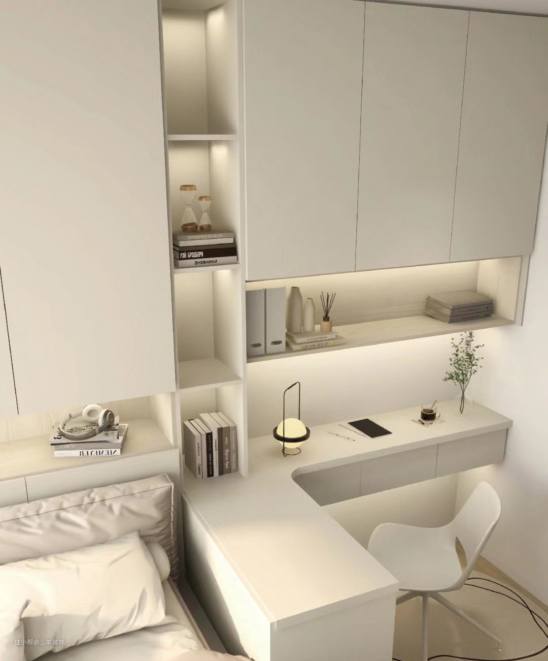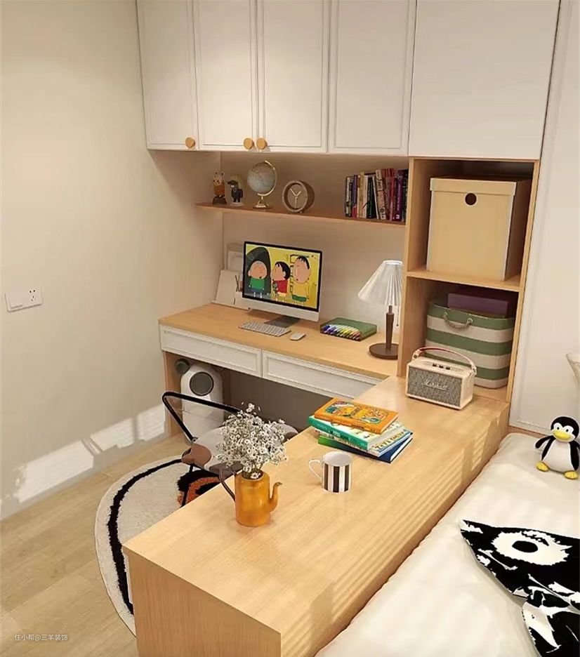 小卧室采光很好。在窗户边定制一款L型的书桌,与床头的衣柜是一体式设计。同样做了置顶柜子,可用于家庭存放多个物件。柜子下面做了一个简易的书架,下面有三个镂空的置物架。平时想展示的小物件可以放在这里。