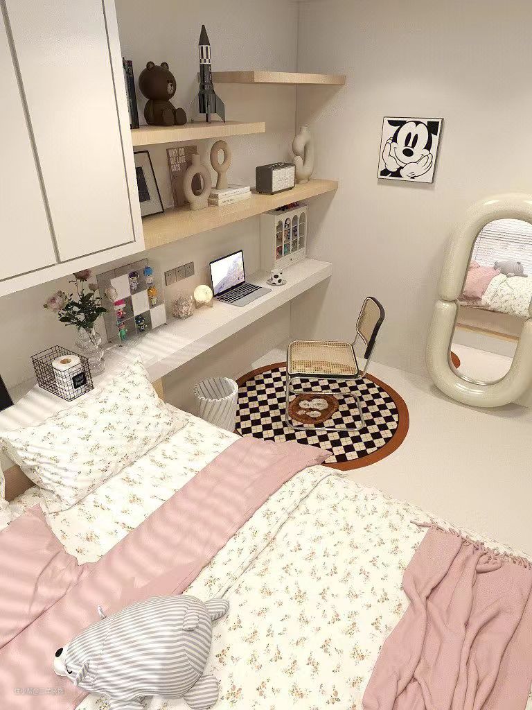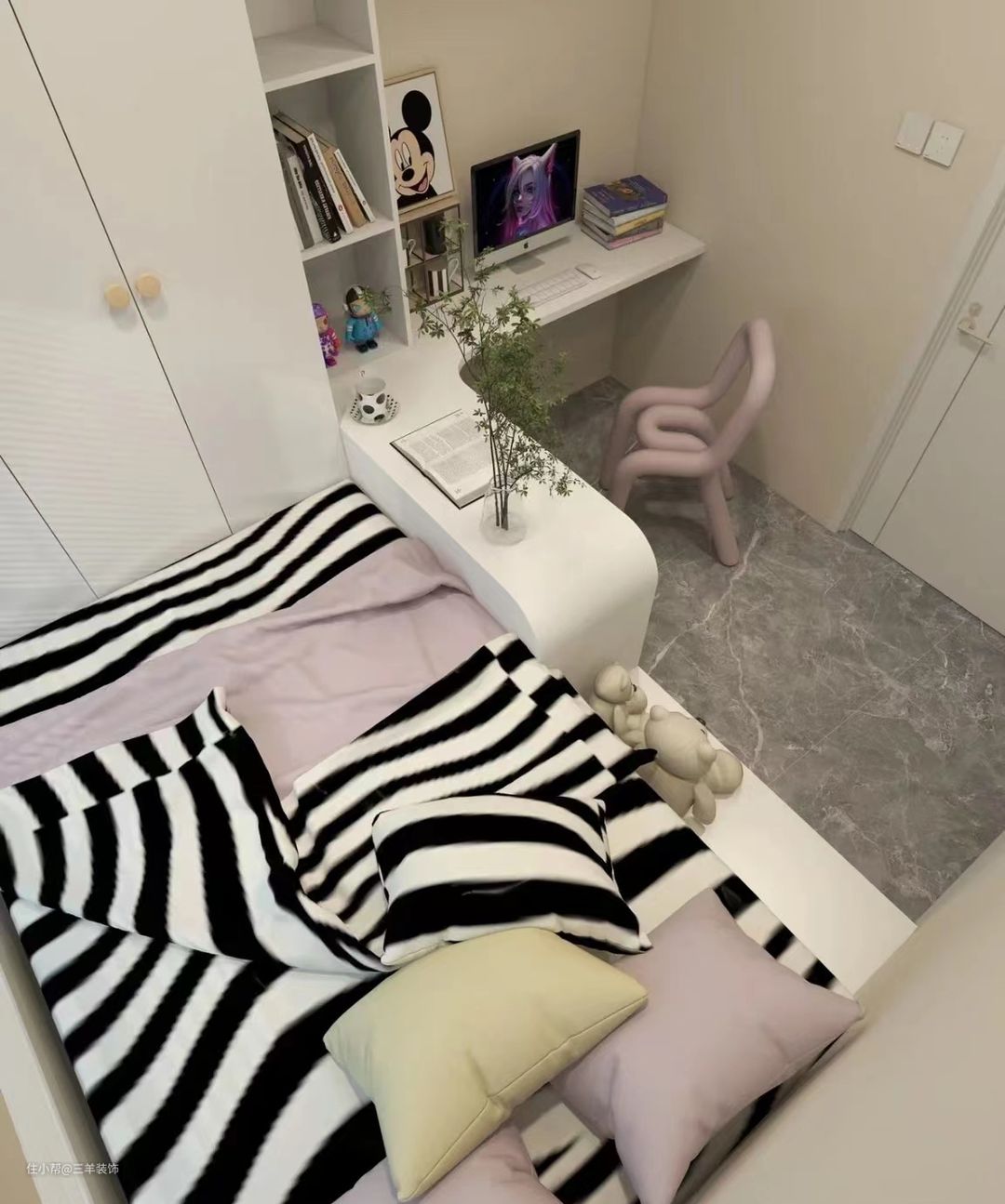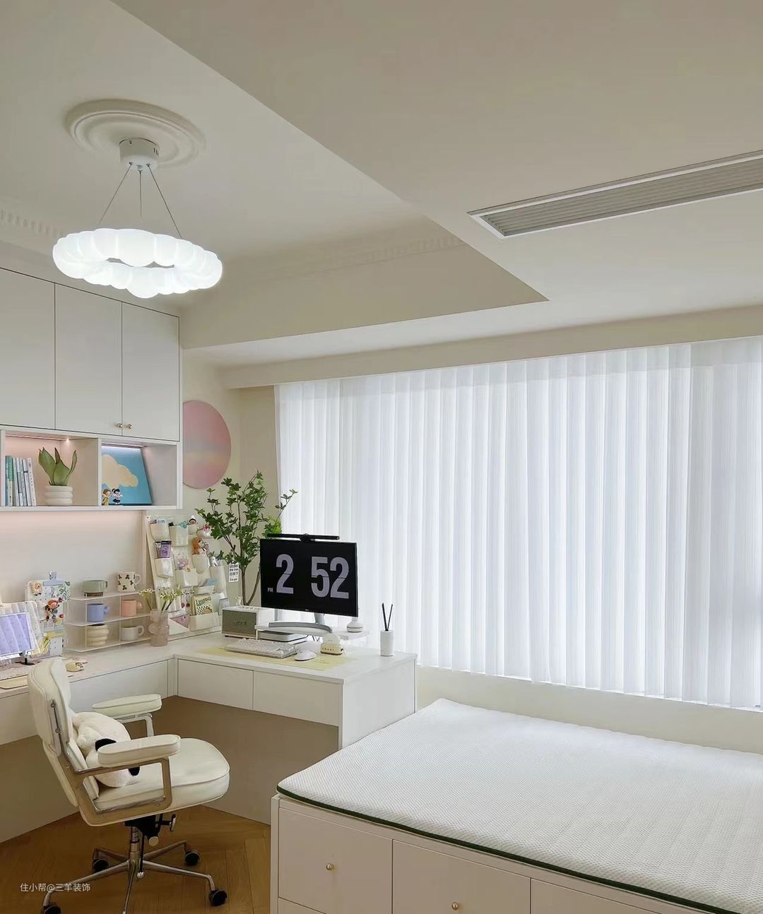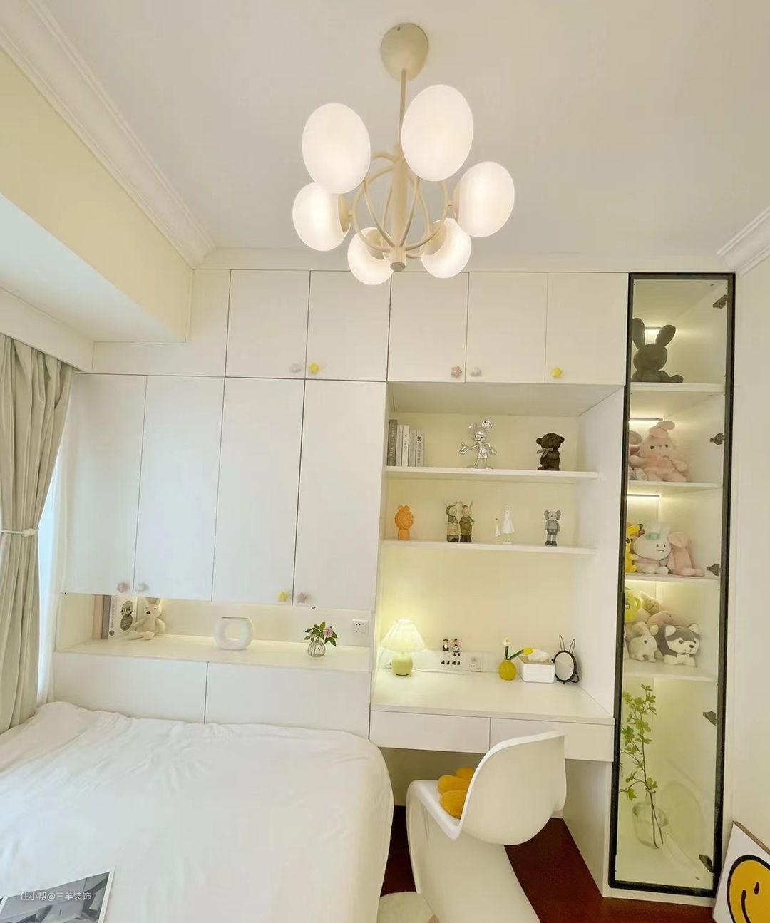 小卧室采光很好。在窗户边定制一款L型的书桌,与床头的衣柜是一体式设计。同样做了置顶柜子,可用于家庭存放多个物件。柜子下面做了一个简易的书架,下面有三个镂空的置物架。平时想展示的小物件可以放在这里。