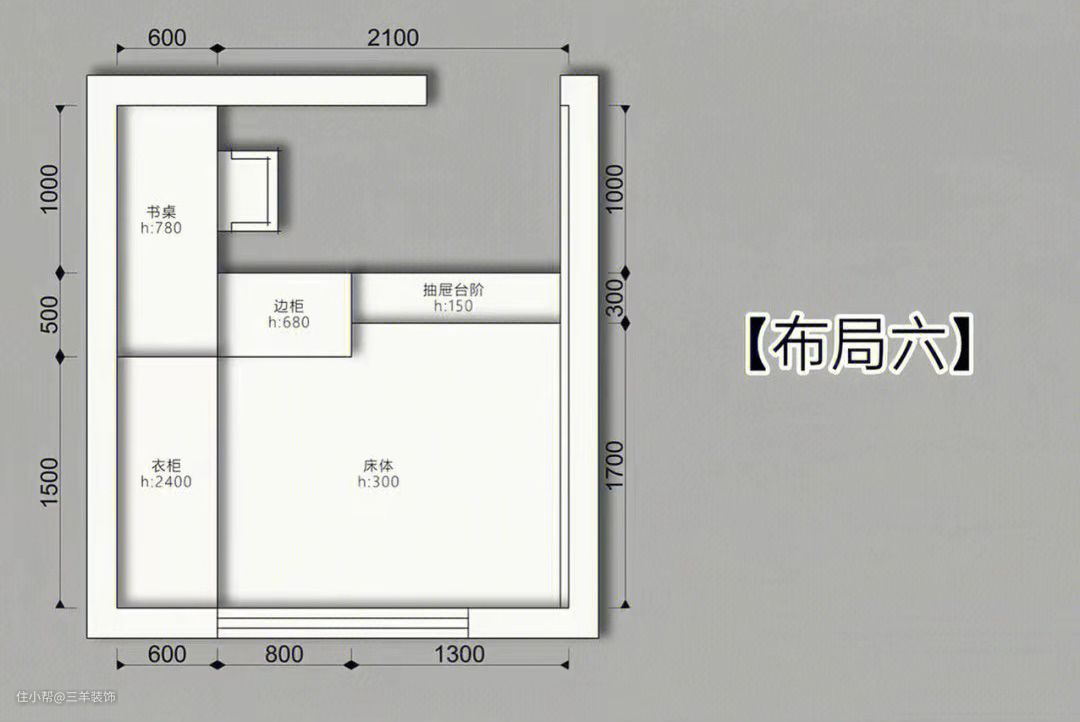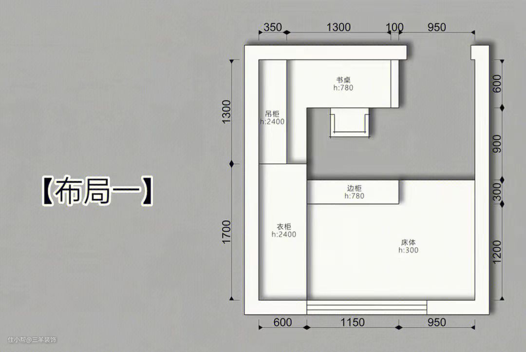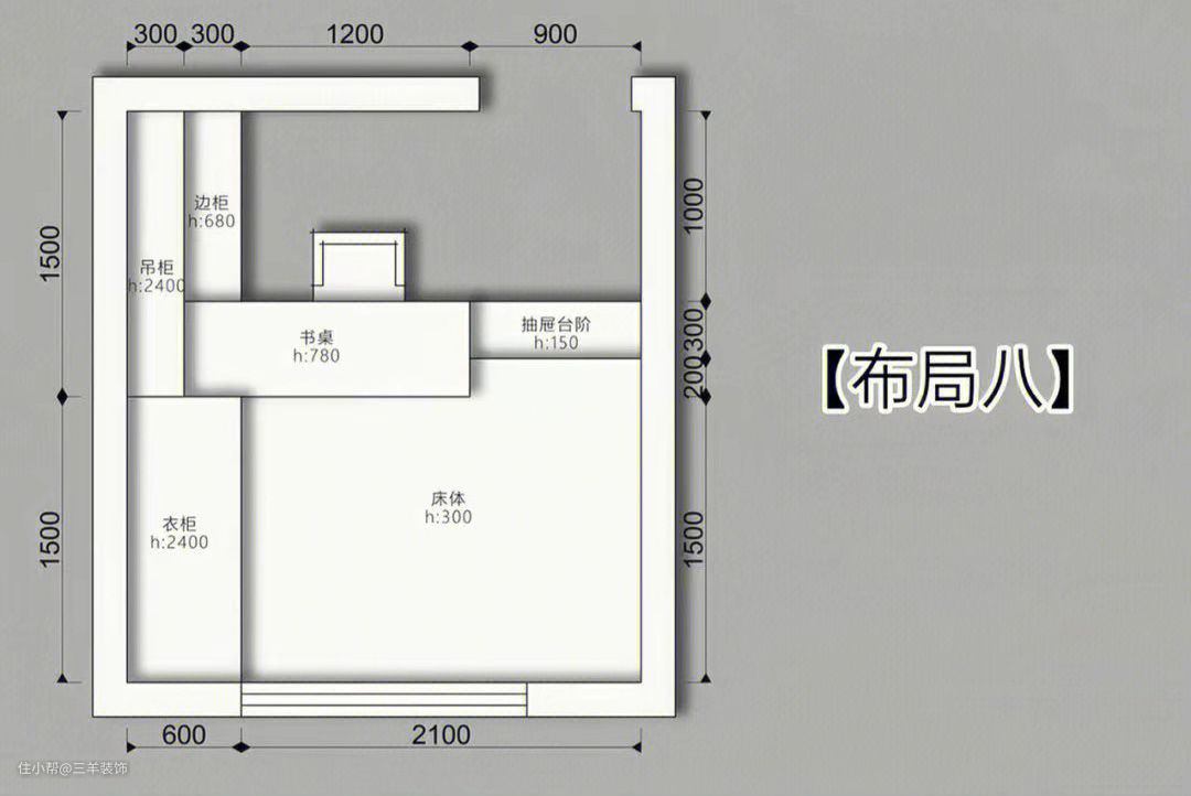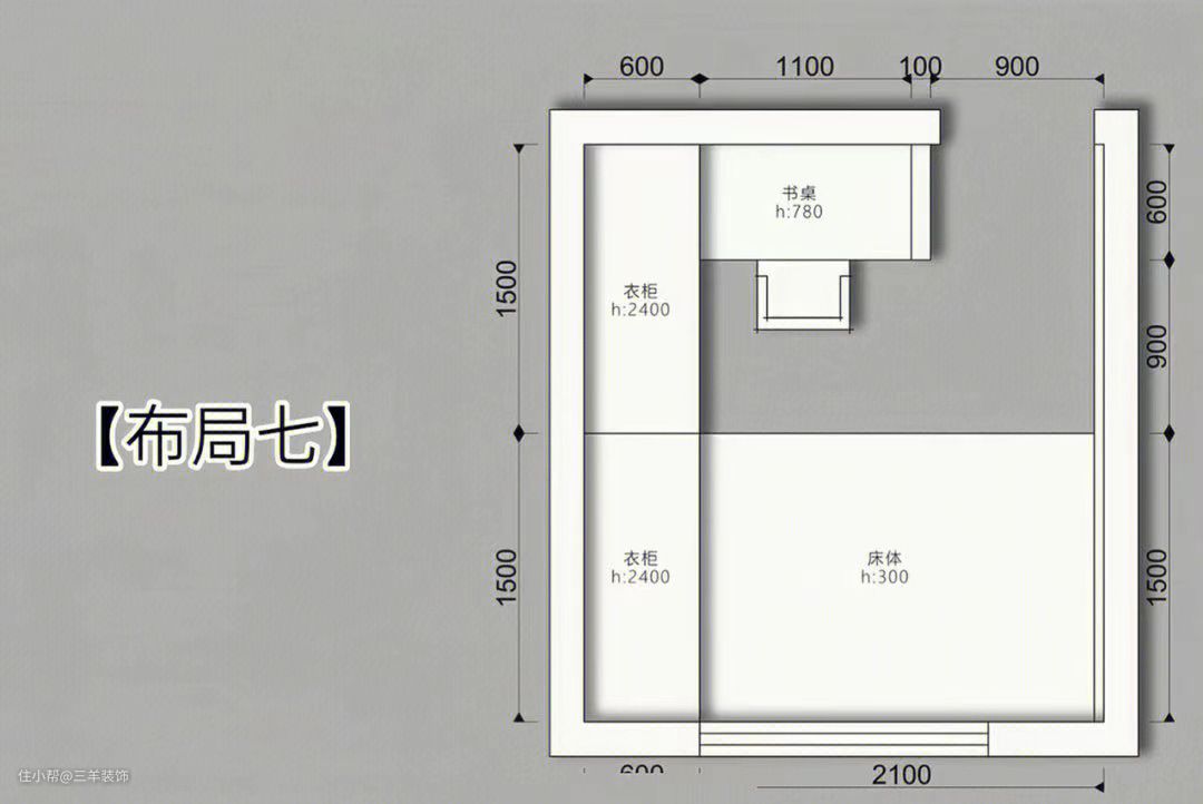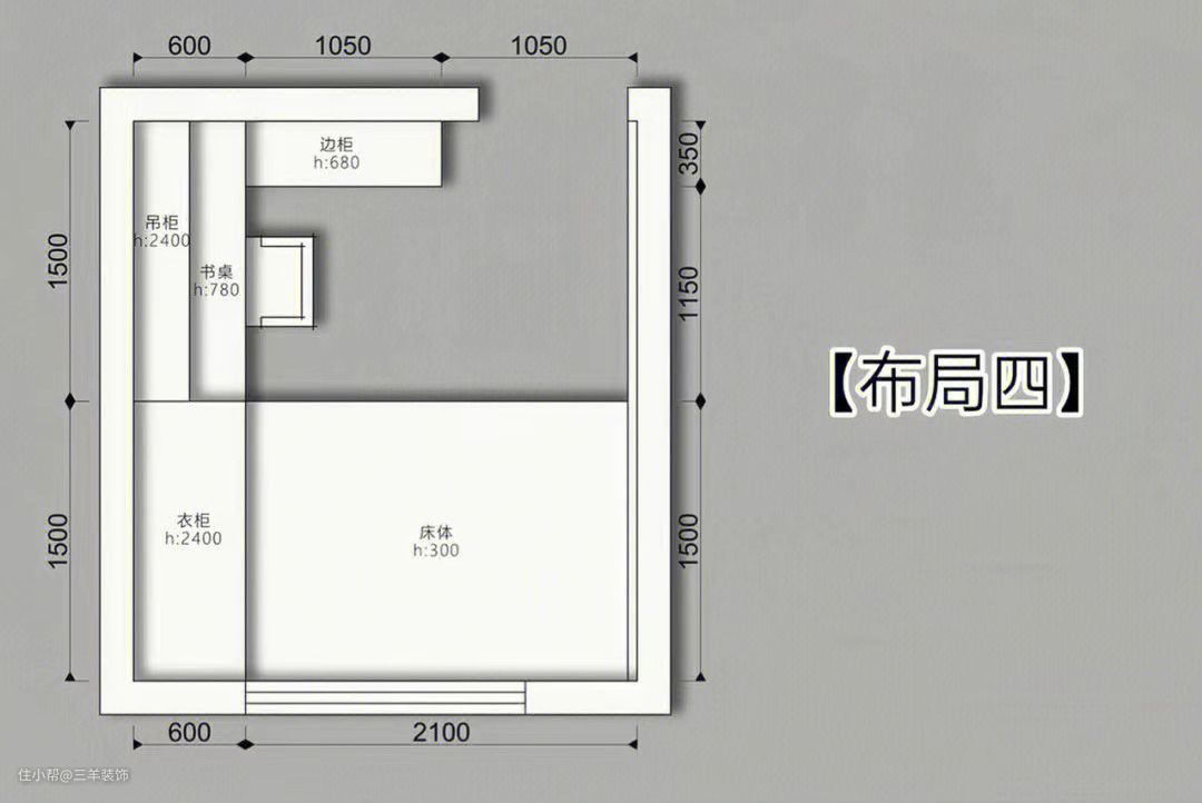 如果如下图格局非常小的空间,窗户位置在左边,需要在右边做衣柜,桌子放在左边,同时满足二次卧室和收纳,书房的功能也可以兼备。
