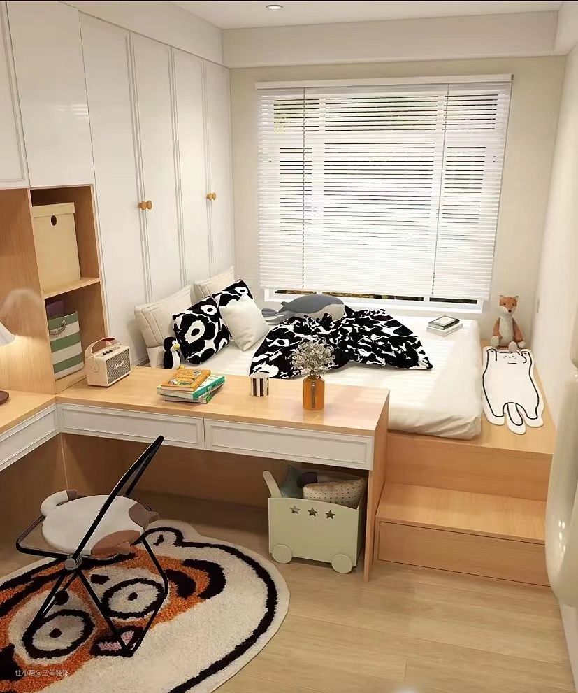 小卧室靠窗户定制榻榻米,做一个和书桌平高的床头,把剩下两边的木材翻过来用作护墙板使用。